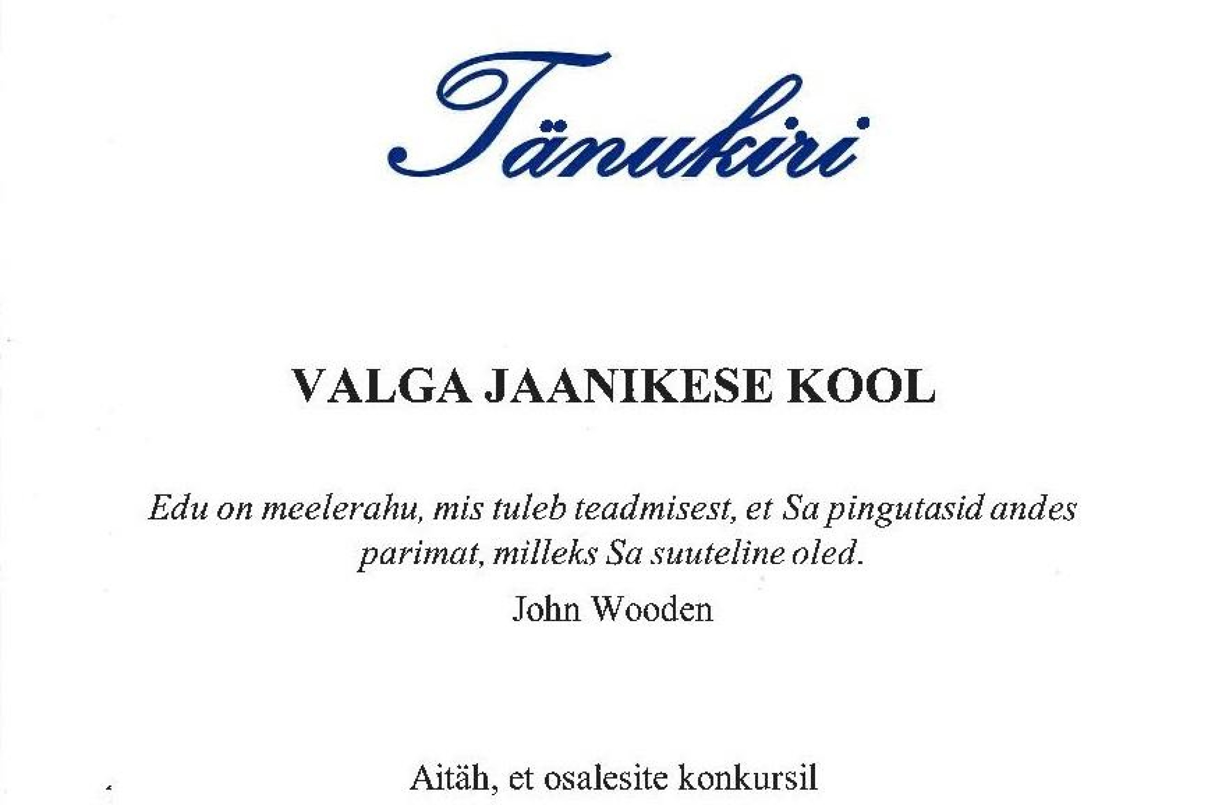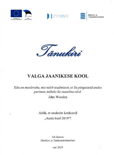 Osalesime „Aasta Kool 2019“! konkursil. Esitasime ja valmistasime 2 min kooli tutvustava video. Kogu koolimeeskond töötas ja mõtles kaasa. Saime kogemuse võrra rikkamaks. Oli palju põnevust, õppisime üksteist tundma ja mis peamine, meil on oma koolist vahva video. Finaali me ei pääsenud küll aga kaunistab meie kooli uhke tänukiri. Tekst tänukirjal: „Edu on meelerahu, mis tuleb teadmisest, et Sa pingutasid andes parimat, milleks Sa suuteline oled. John Wooden.