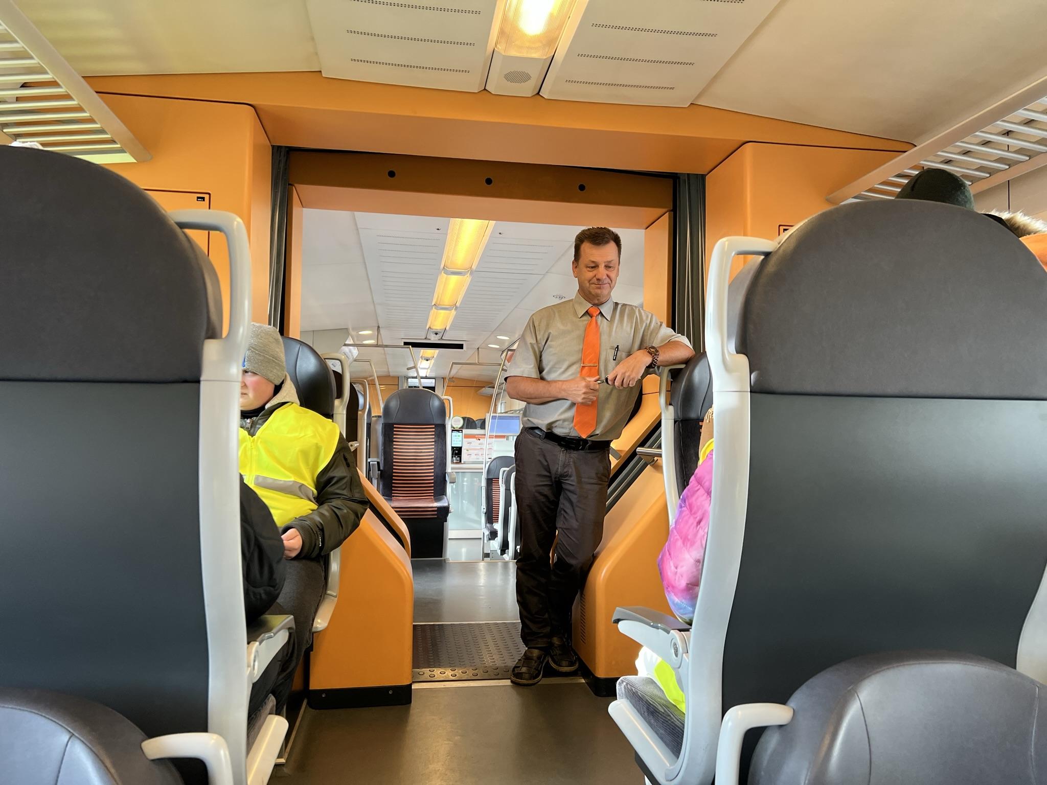 Seejärel läksime perroonile, kus meist tuhises mööda raudtee rööpaid kontrolliv rong. Ja siis, lõpuks ometi saabus porgandi värvi Elroni rong. Läksime rongi ning meiega liitus tore rongijuht, kellelt sai vastuseid igasugustele küsimustele. Meie rongijuht on töötanud selles ametis juba kolmkümmend aastat. Rongijuht kiitis praegust rongi – seda on lihtne ja mugav juhtida.