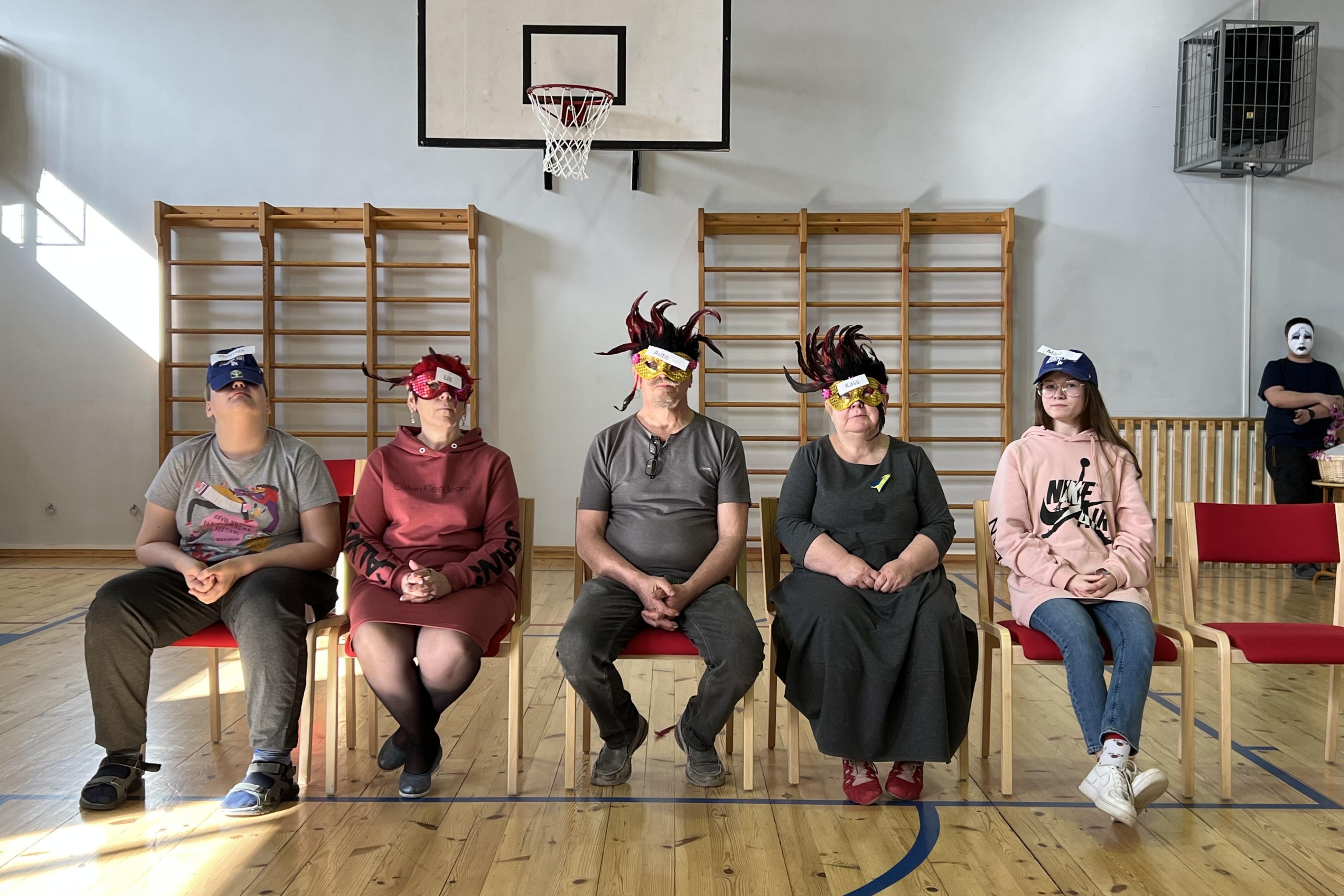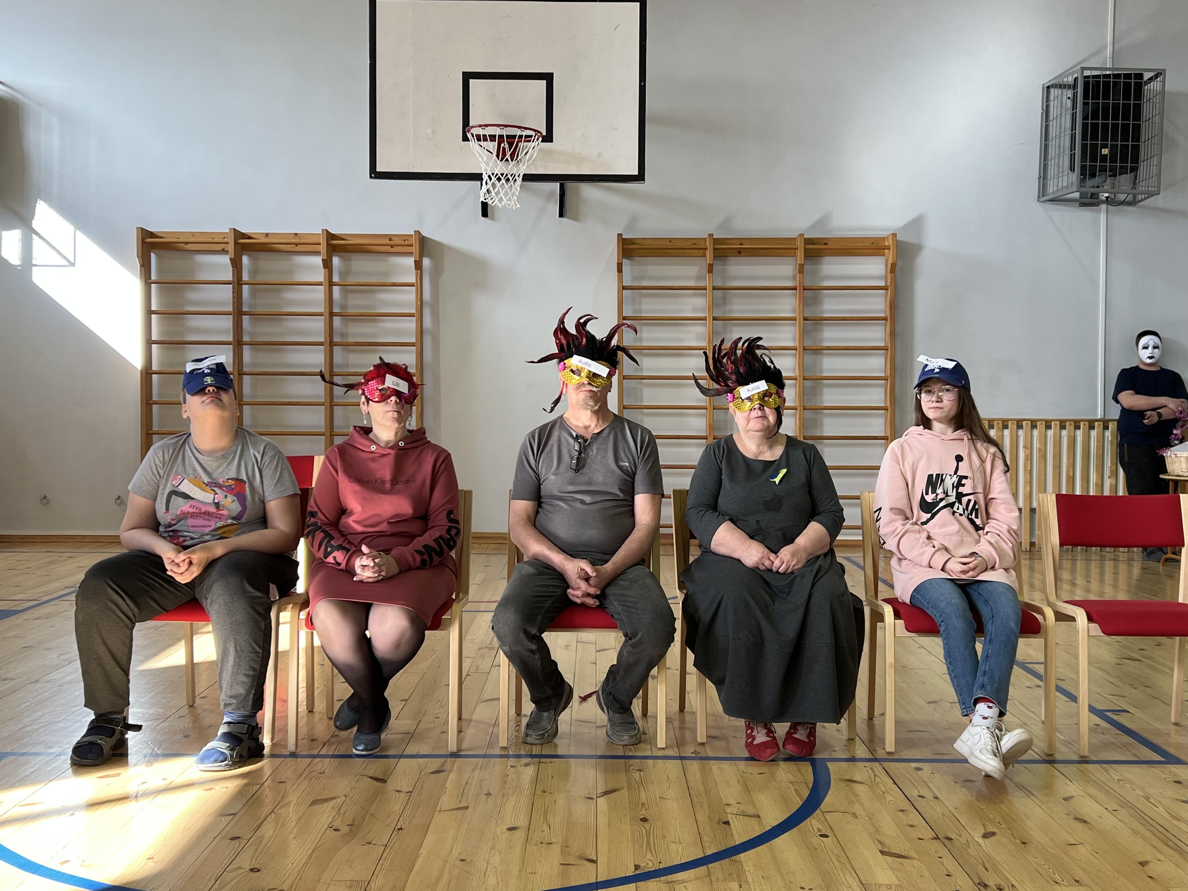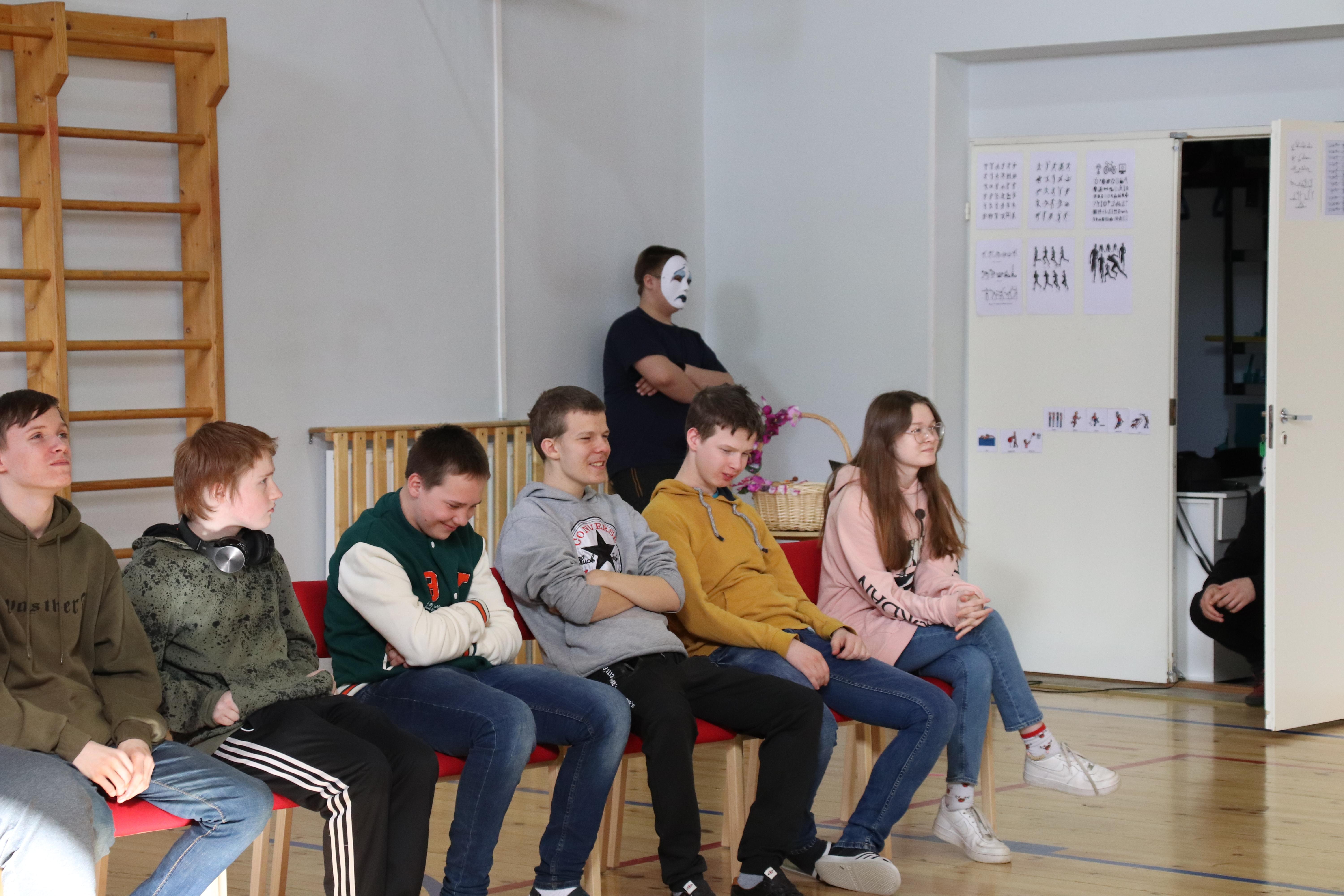 Esmaspäeval tähistas meie kool teatripäeva. Kõigepealt tutvusime teatrimaailma sümbolitega, kelleks olid naerev ja nuttev mask. Seejärel esitasid teatriringi lapsed väikese improetenduse. Õpetaja Oksana klassi poisid istusid ees toolidel, näoga saali suunas, st nad olid nagu kinos. Sisenes Hardi ja palus igat poissi eraldi, et see istuks ühe koha võrra edasi, et tema saaks oma tütarlapsega, kelleks oli Marina, kõrvuti istuda. Aga keegi polnud nõus ja nii istusid poiss ja tüdruk rea äärekohtadel. See kõik oli tore pantomiim, kuidas poiss seansi ajal tüdrukule lilli, õhusuudluse jne saadab, mille vahepealsed poisid edastavad üksteise kaudu tüdrukule. Siis neiu ja noormees lehvitavad üksteisele. Lõpuks saadab poiss kommikarbi. Poisid annavad küll karbi edasi, aga söövad ka ise komme. Tüdrukuni jõuabki tühi karp. Ja oh õnnetust – tüdruk solvub ning tormab minema. Kui lahedalt nad seda tegid! Kõik vaatasid, said aru ja jälgisid mängu.