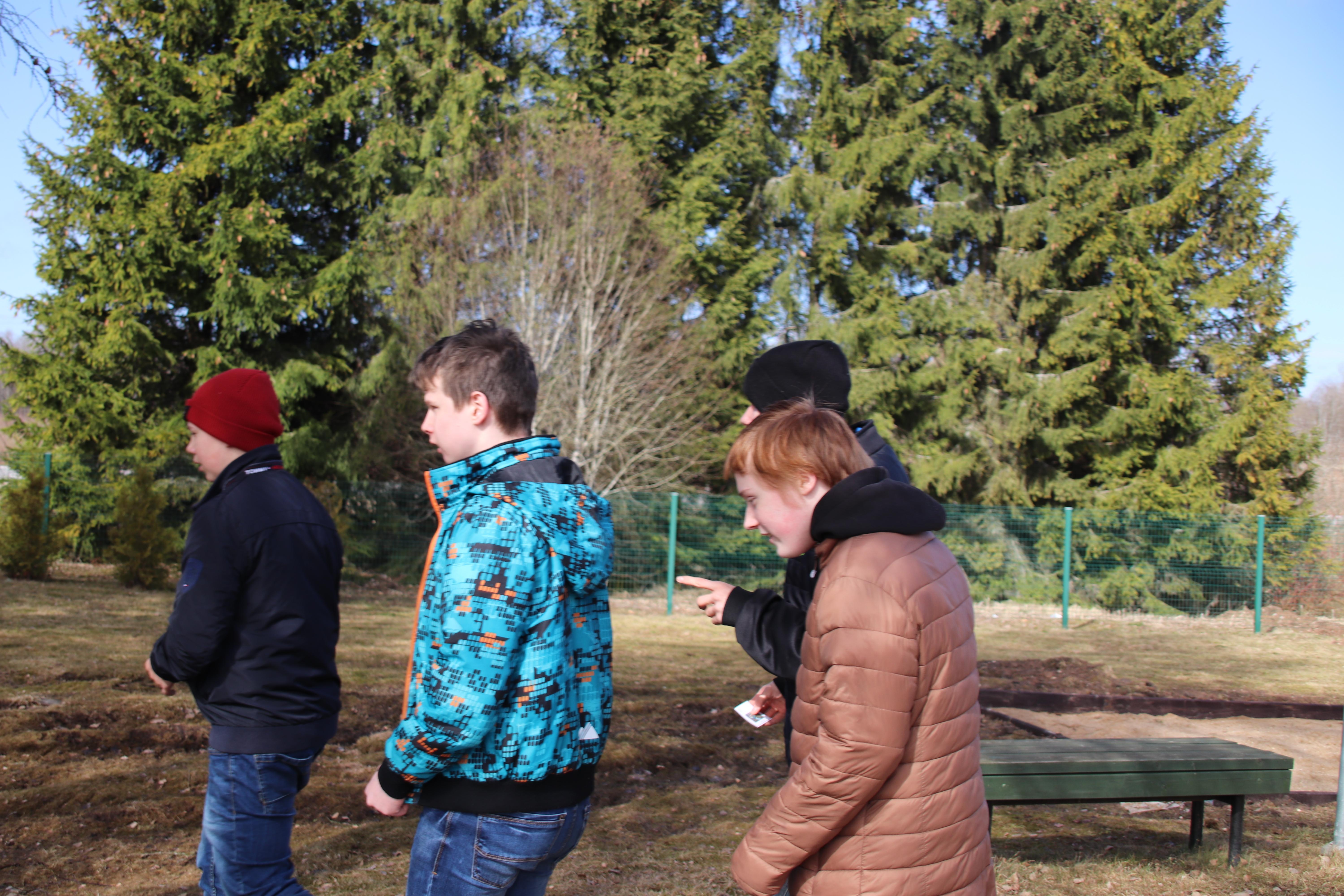 Täna säras päike taevas, ülesanded jagatud ja maastikumängu start võis alata. Kooli territooriumilt tuli leida igale rühmale antud erinev ülesanne: otsida klotsile kleebitud paiselehe- või võilillepilti jne. Võidukalt võilille piltidega saabunud Zigmunds sai pettumuse osaliseks, kui selgus, et nende rühm peab hoopis paiselehte otsima. Nii me siis otsisime erinevaid kevadmärke ja saime targemaks. Õpilasesindusest olid abiks, Marina, Hardi ja Sander.