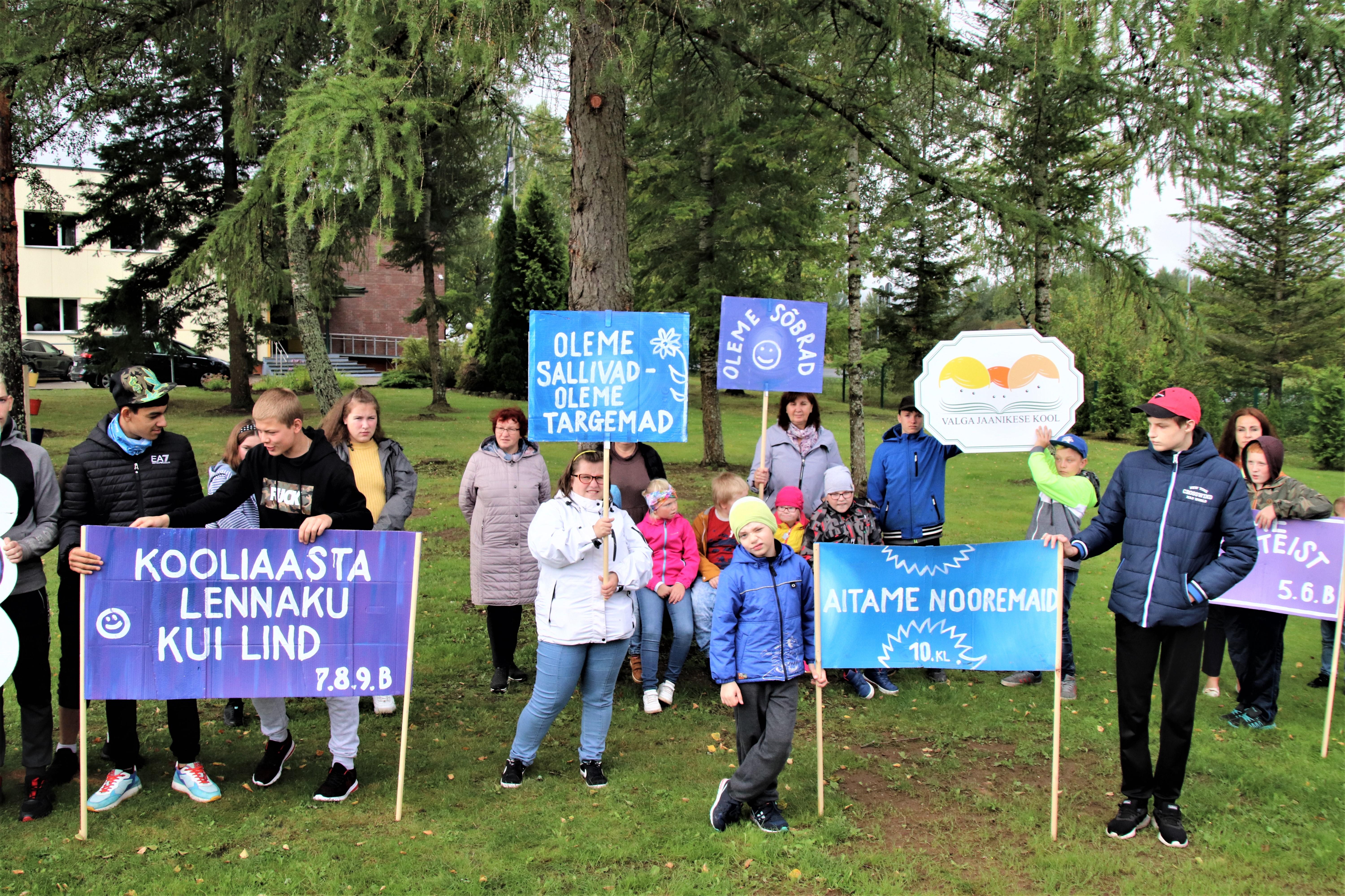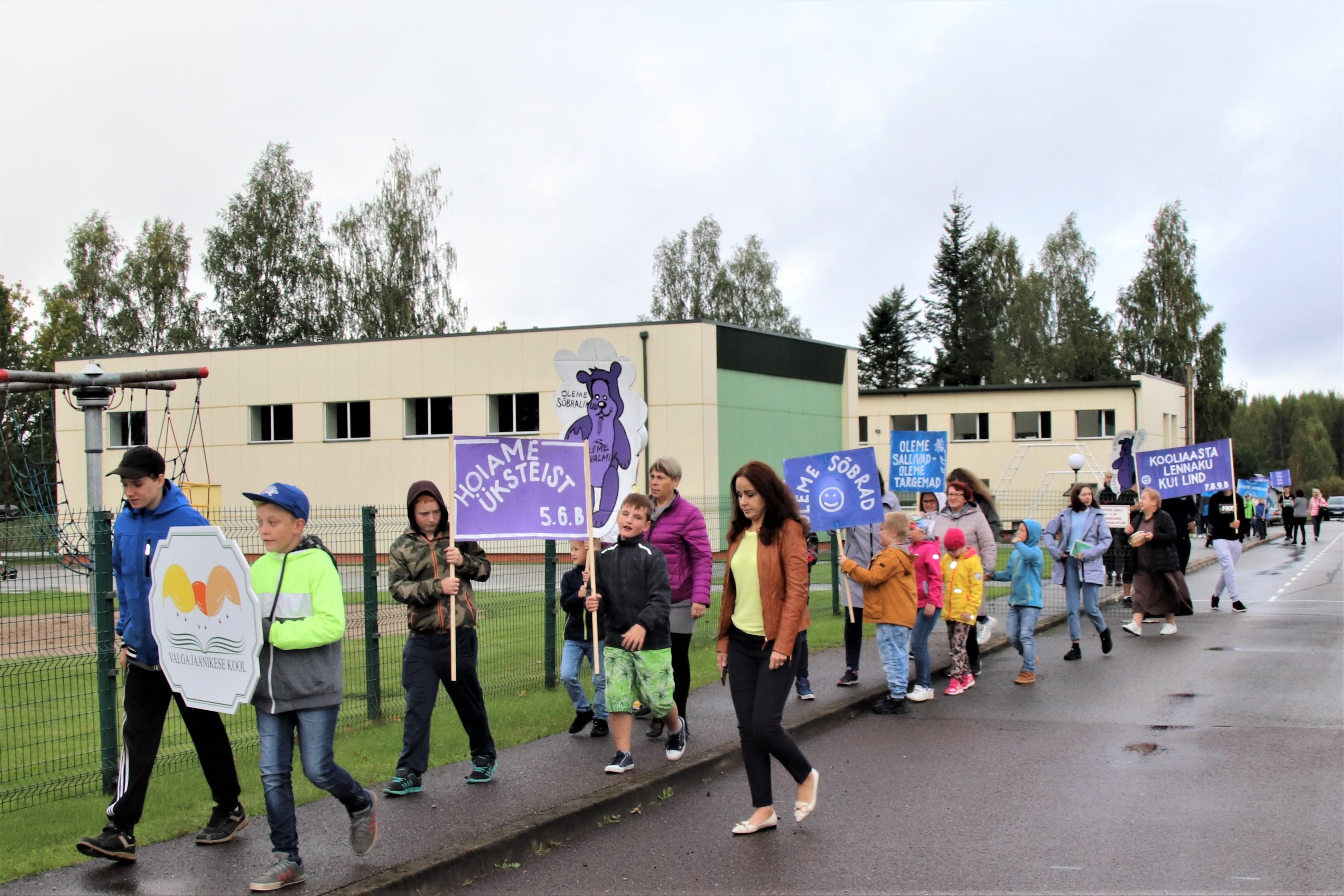 Ürituse algul võtsime kätte plakatid oma toredate mõtetega ning tegime väikese rongkäigu ümber koolimaja. Et samm oleks kergem ja meel rõõmsam , põristasid õpetajad Maret ja Jelena trummi. Seejärel kogunesime kooli aeda õuesõppeklassi juurde. Huvijuht Külli oma kõnes kordas ka meie armastatud helilooja Arvo Pärdi sõnu: „Iga inimese hing on kui kalliskivi. Hoiame siis kõik koos seda, et ta heliseks igal ajal ja igal pool“.