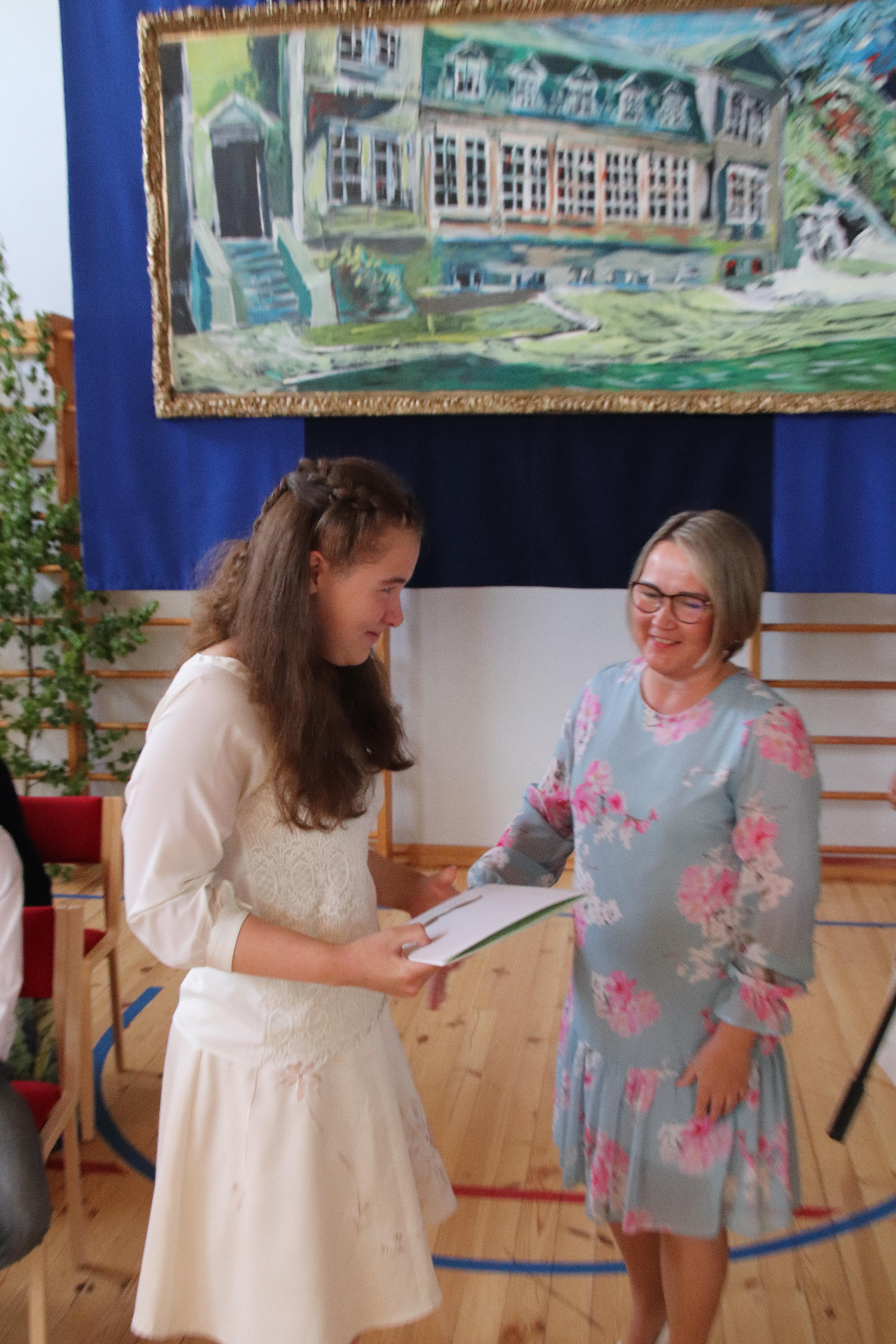 Direktor andis lõpetajatele kätte lõputunnistuse ning lilleõie, samuti koolipoolse kingikoti. Igat lõpetajat käisid õnnitlemas kutsutud külalised, aga väga südamlik on ka see, et meie õpetajad õnnitlevad lõpetajaid, kes lilleõie, kes šokolaadi või kommipakiga. Nii et lõpetajatel oli üsna raske opereerida lillede ja pakkide vahel.