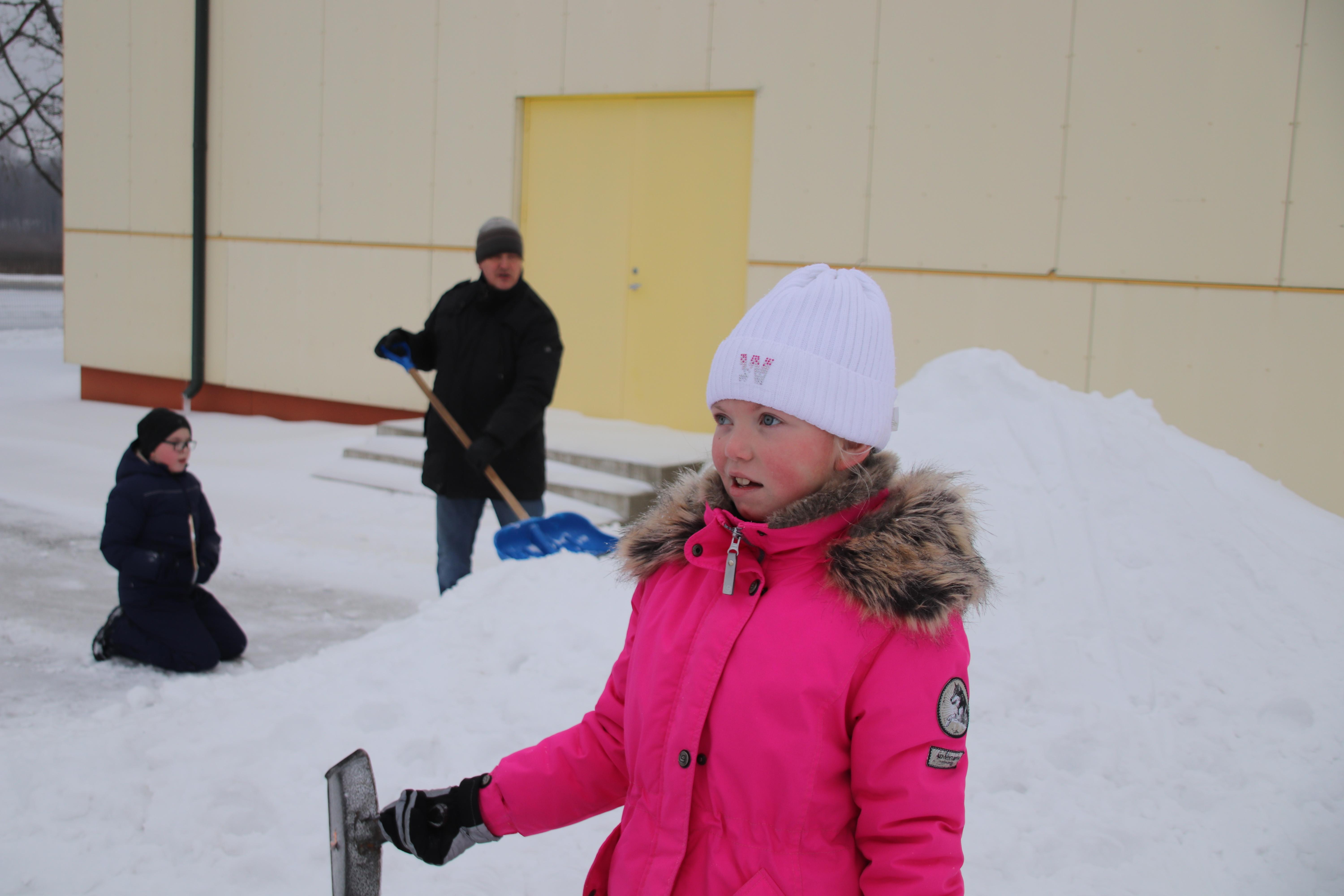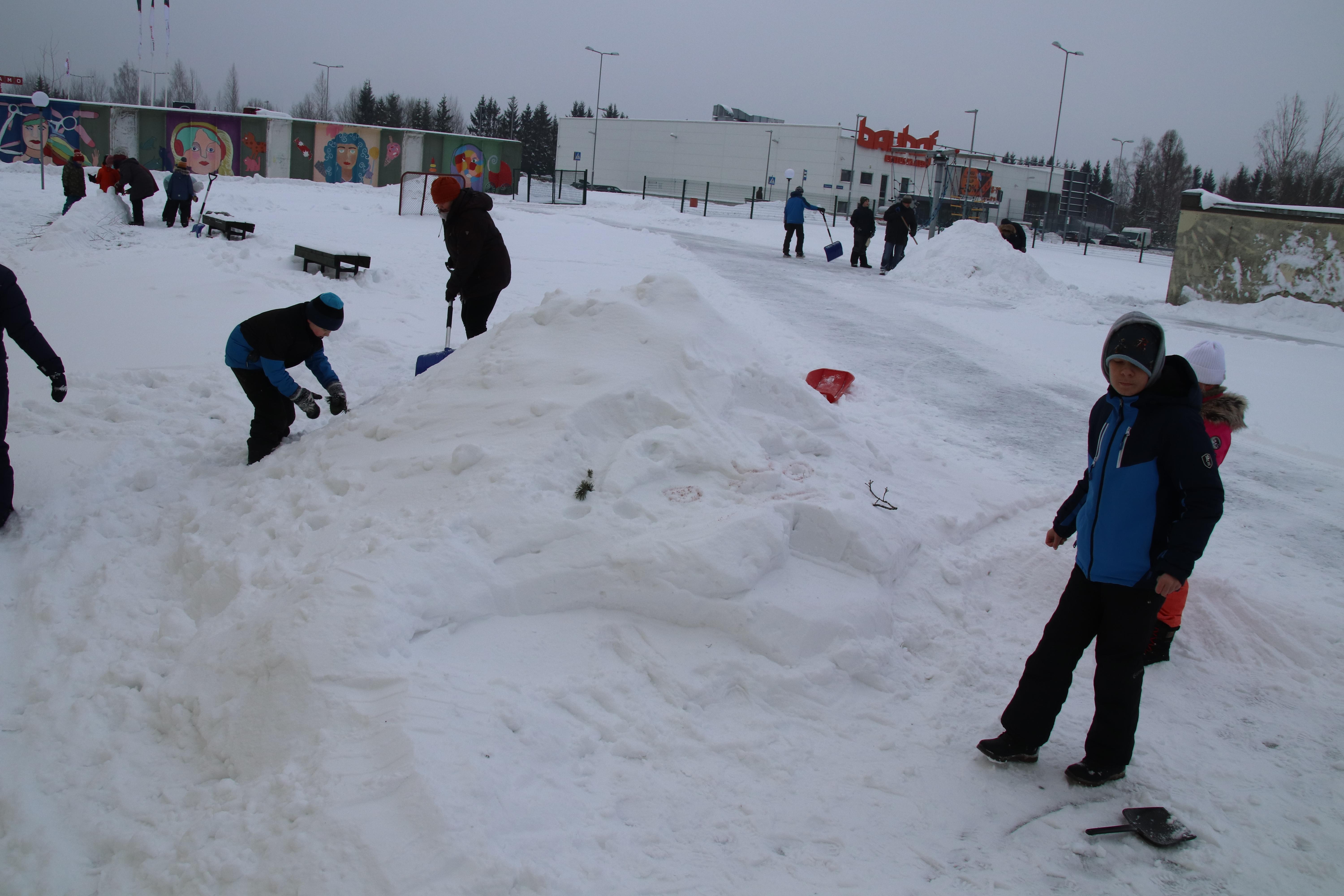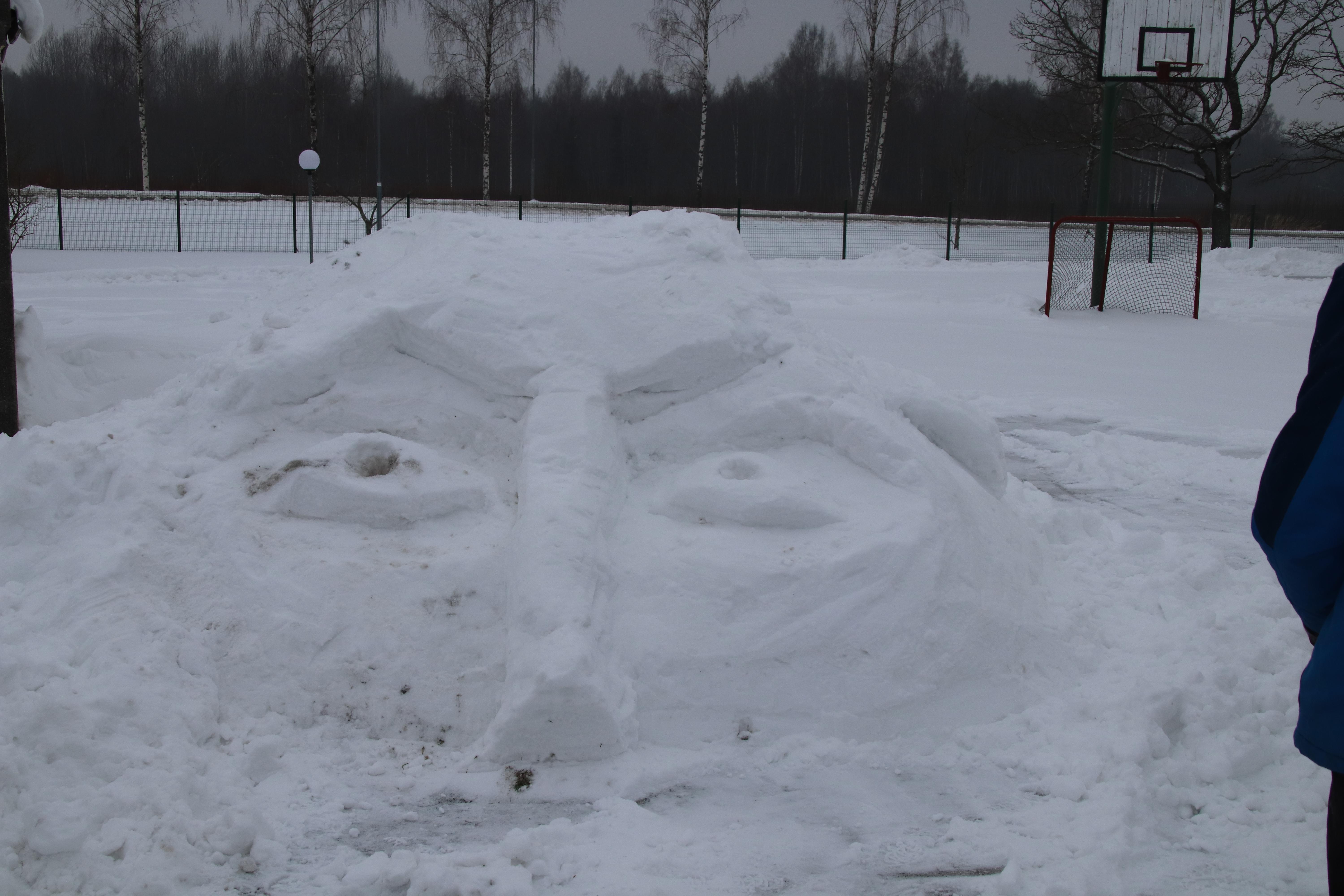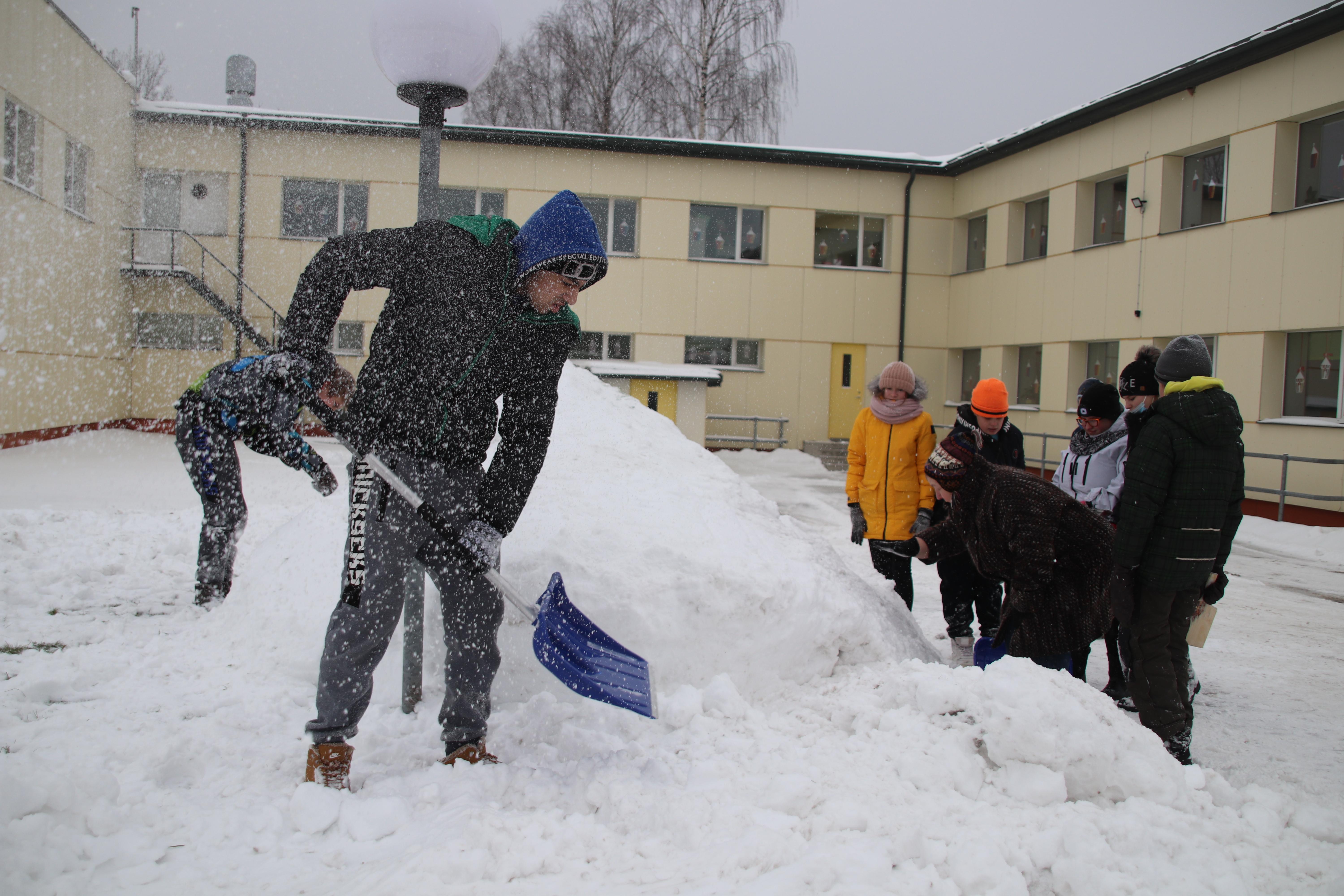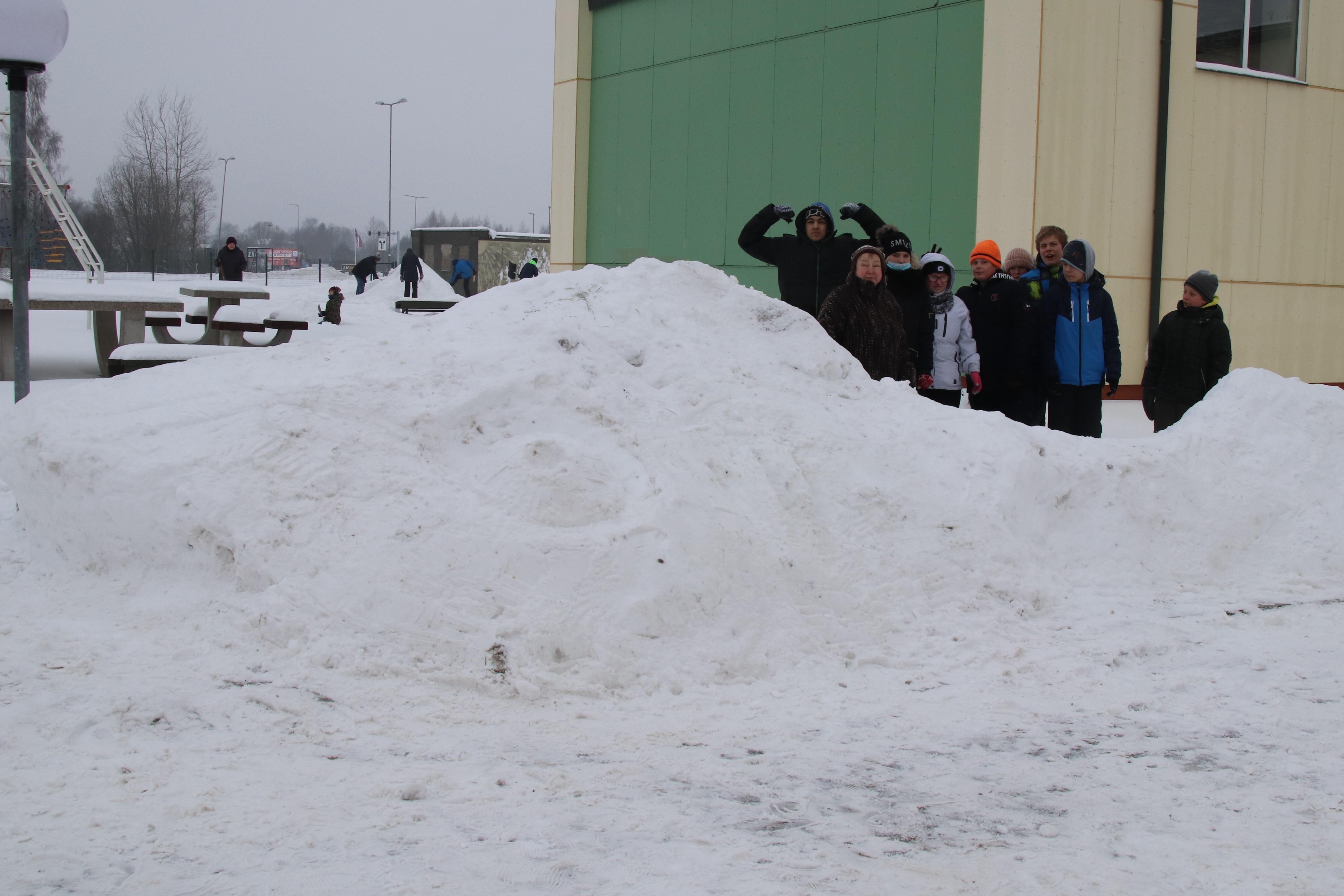 Kuna tööriistadest tuli hiljem tulijatel puudus ja õpetaja Kersti läks neid otsima, lustisid tema lapsed samal ajal niisama lumesõda pidades. Õpetaja tulles hakkas aga kiire töö. Kui väikeste puhul on normaalne, et töö toimub rohkem õpetajate abiga, siis suuremate klasside juures olid labidaga lund kühveldamas ja kujule vormi andmas eriti õpetajad Oksana ja Natalja.