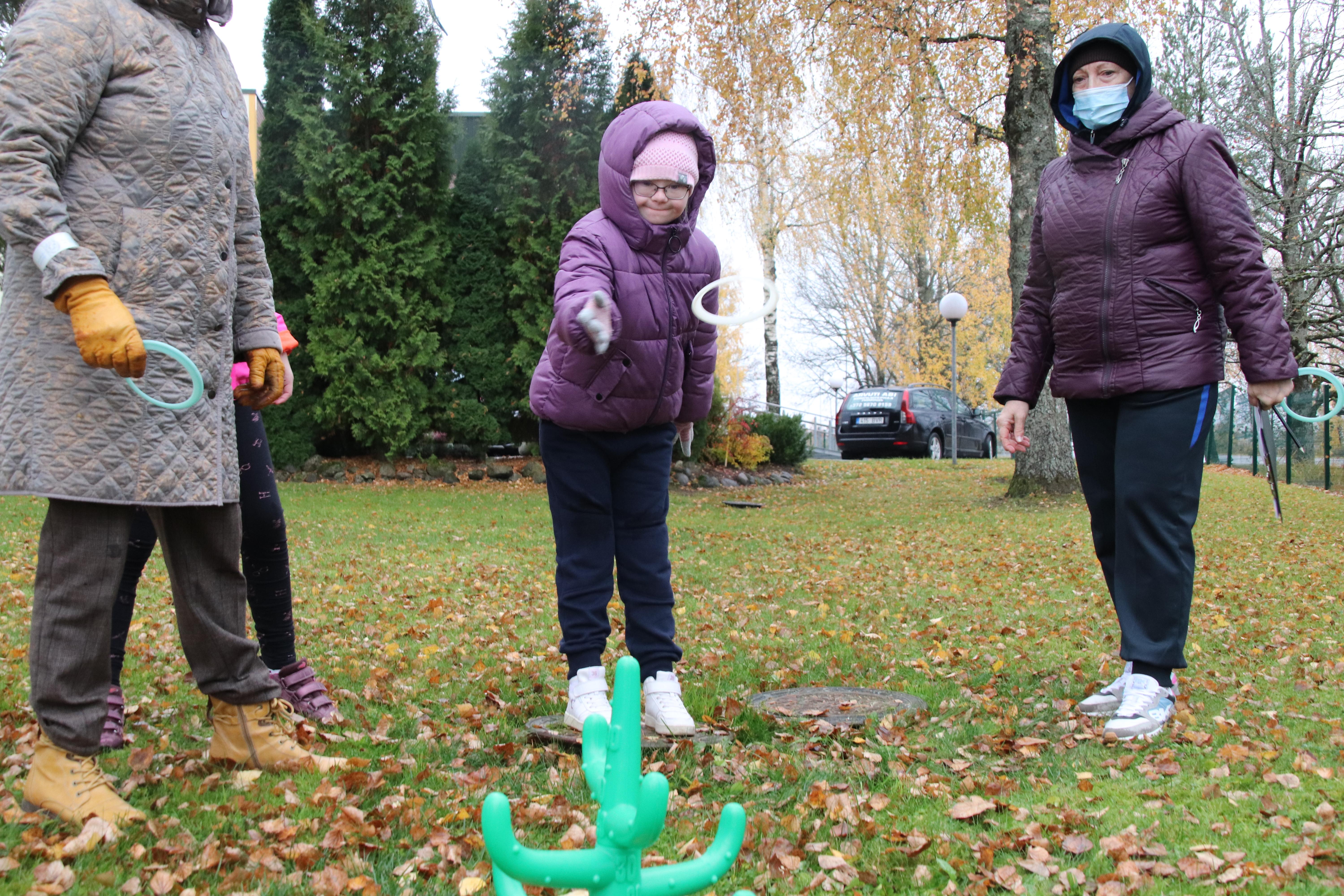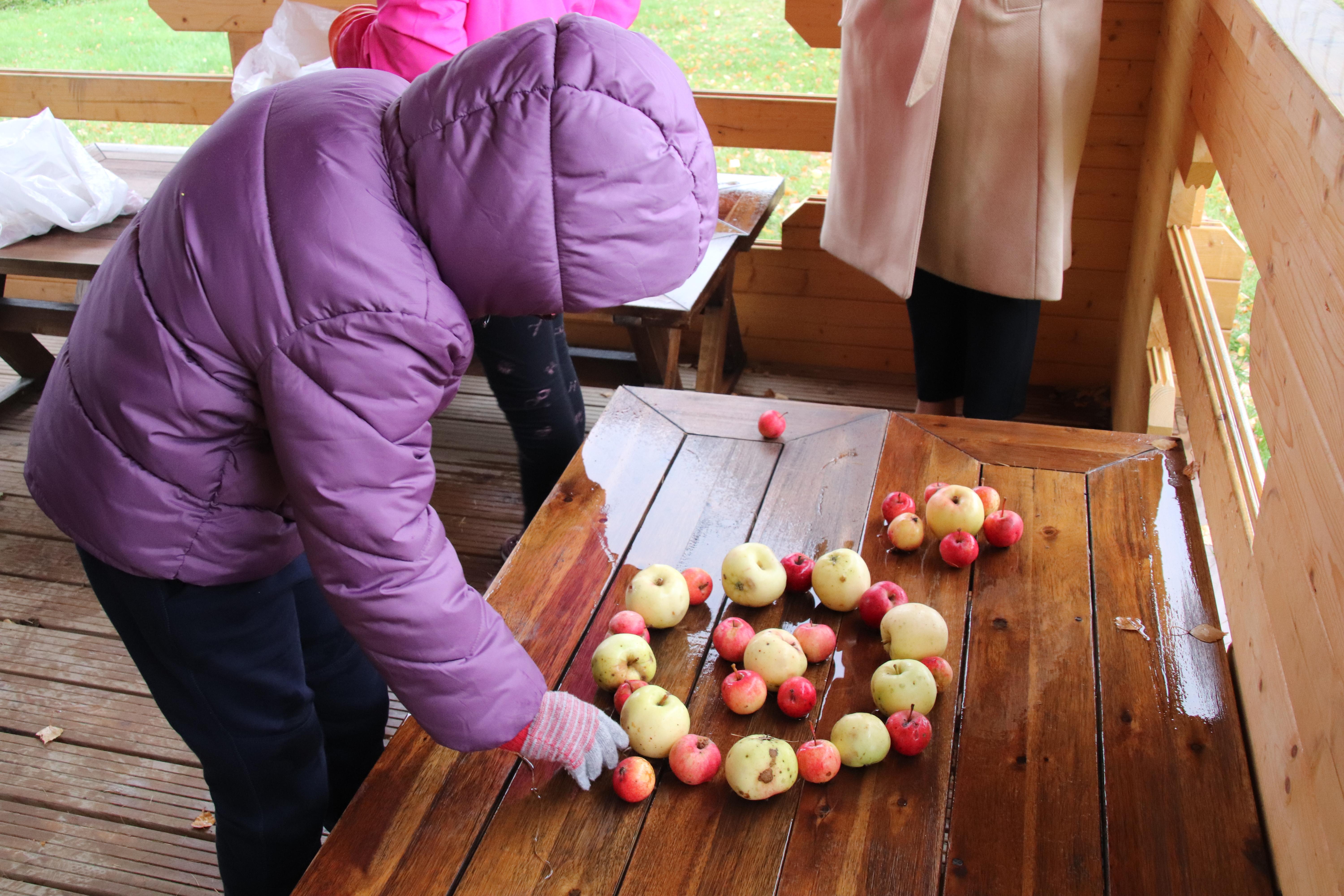 Maastikumängus osalejad on tähelepanelikud – punkt nr 6 leitakse kiiresti. Siin suunab õpetaja Jüri sügisõunu kunstipäraselt pingile paigutama. Ka järgnevad tegevused olid kaasahaaravad: täpsusvise, kotis õige hulga õunte arvamine, looduslikest vahenditest kolmnurga kokkupanek, sügise tunnuste nimetamine, söögiseente teadmise kontroll. Kõik oli põnev! Maastikumängu jäädvustas Marina.