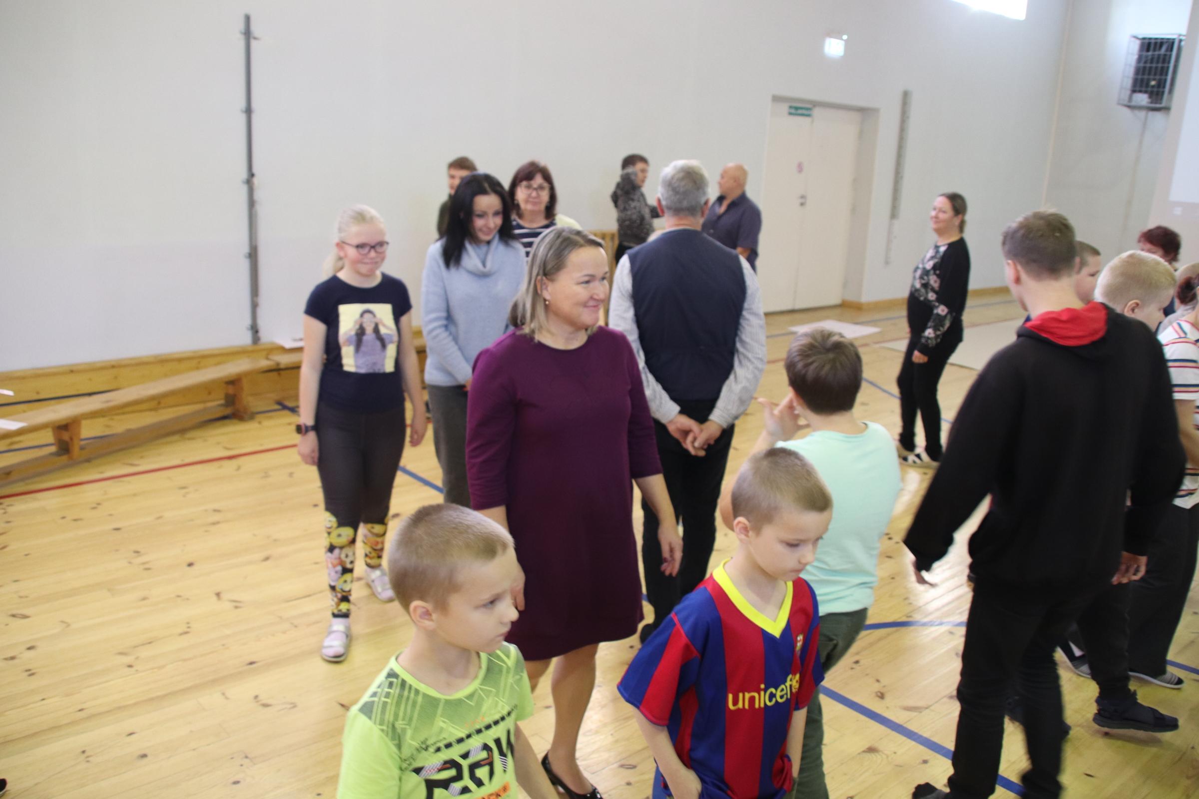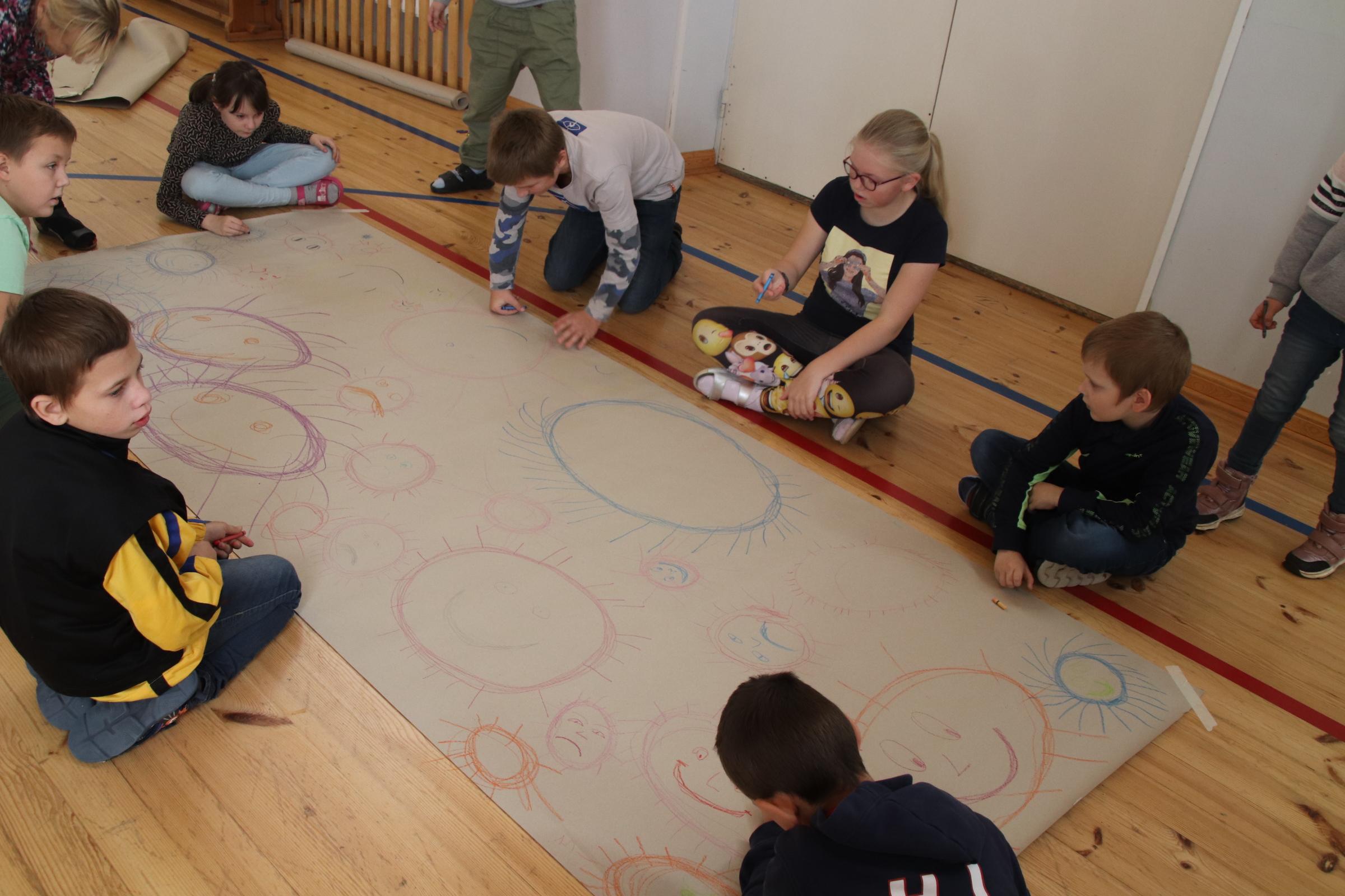 Alustasime kõik koos saalis mõnusa sissejuhatusega ja siis tegelesime grupiti erinevates töötubades. Õpetaja Vadim suunas lapsi läbi mõnusa ja naljaka liikumise end vabaks laskma.Täringuid veeretades tõi juhus erinevaid liikumisviise, kuidas lapsed pidid läbima toredad rajad. Nalja ja naeru oli kõvasti.