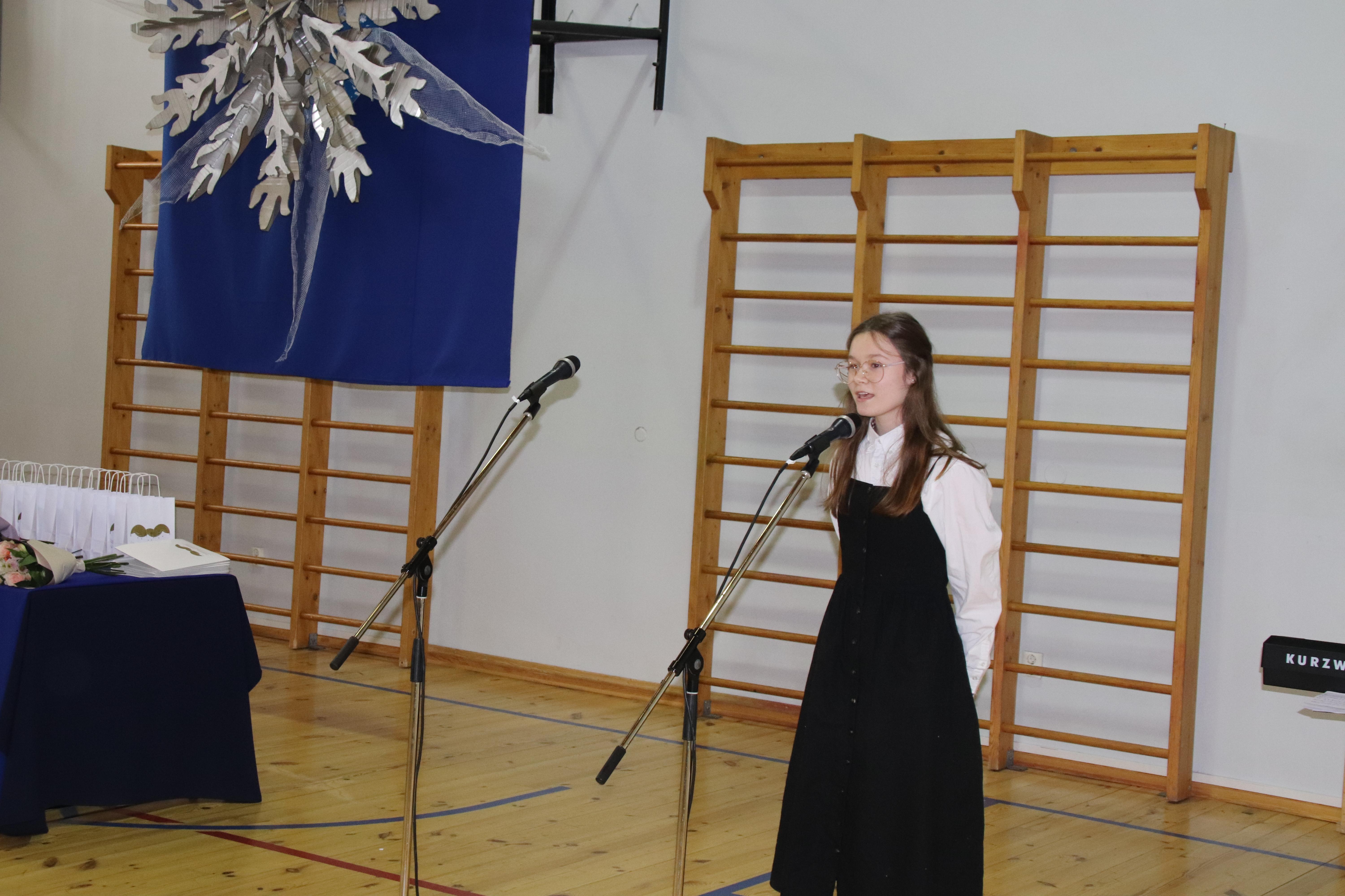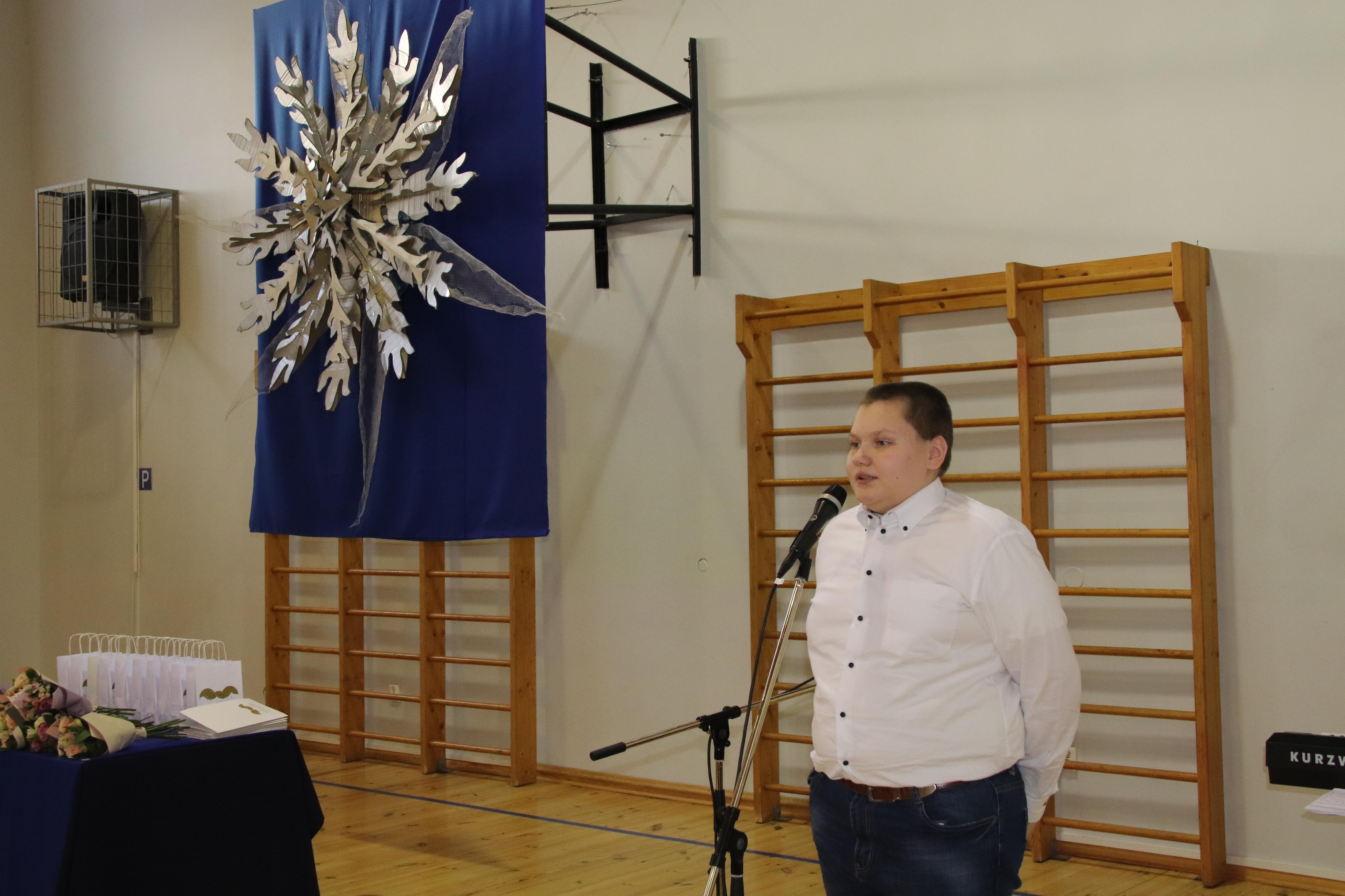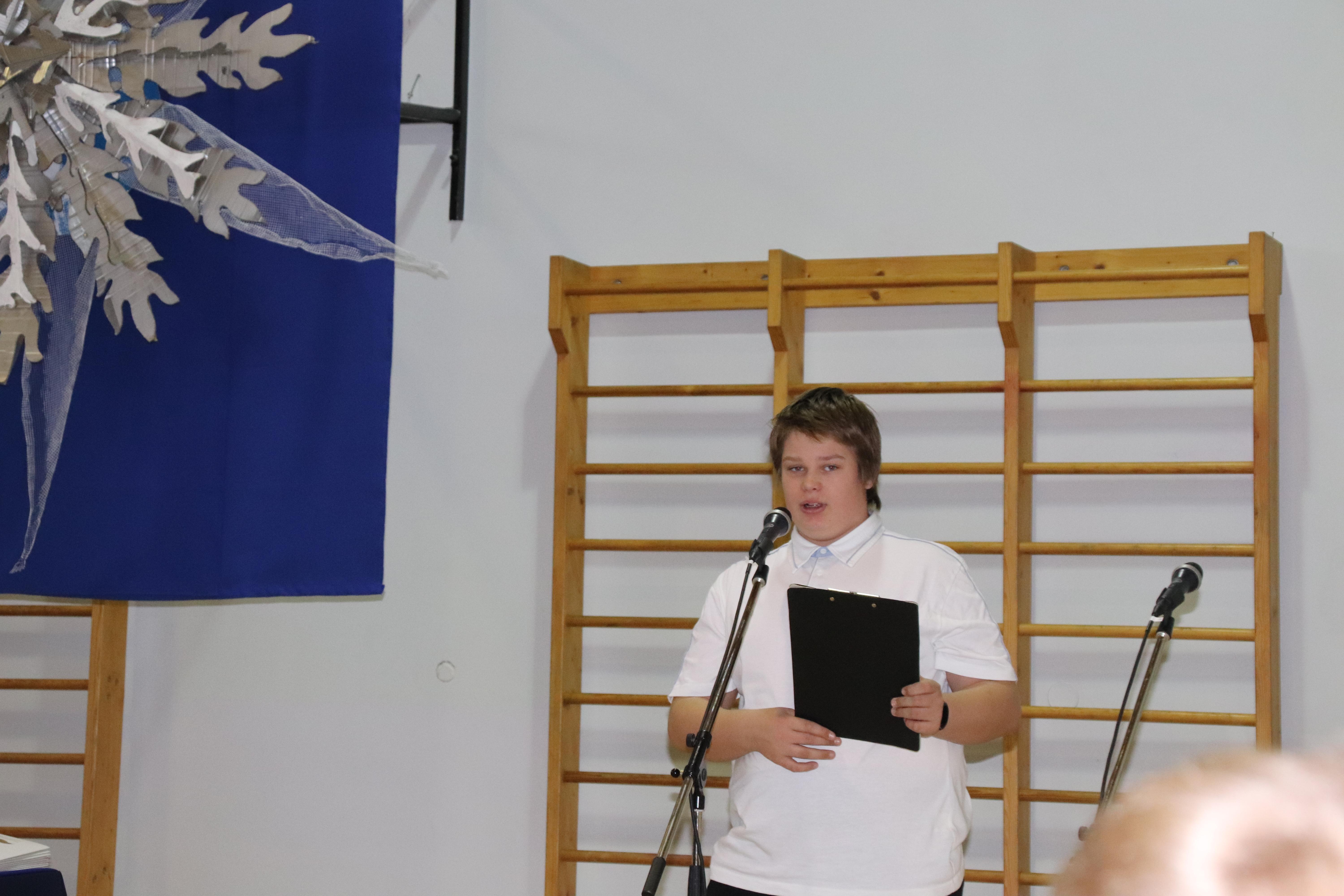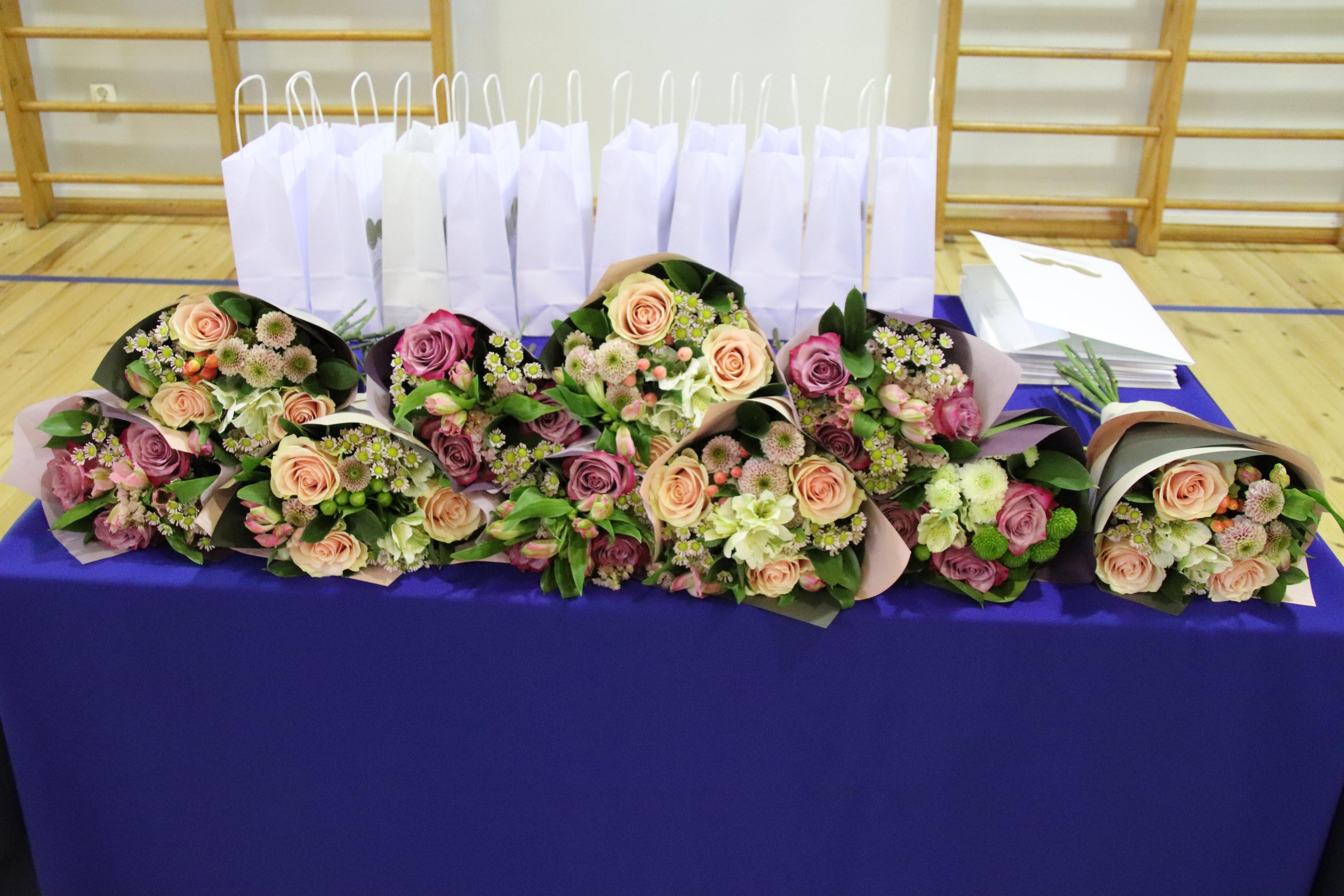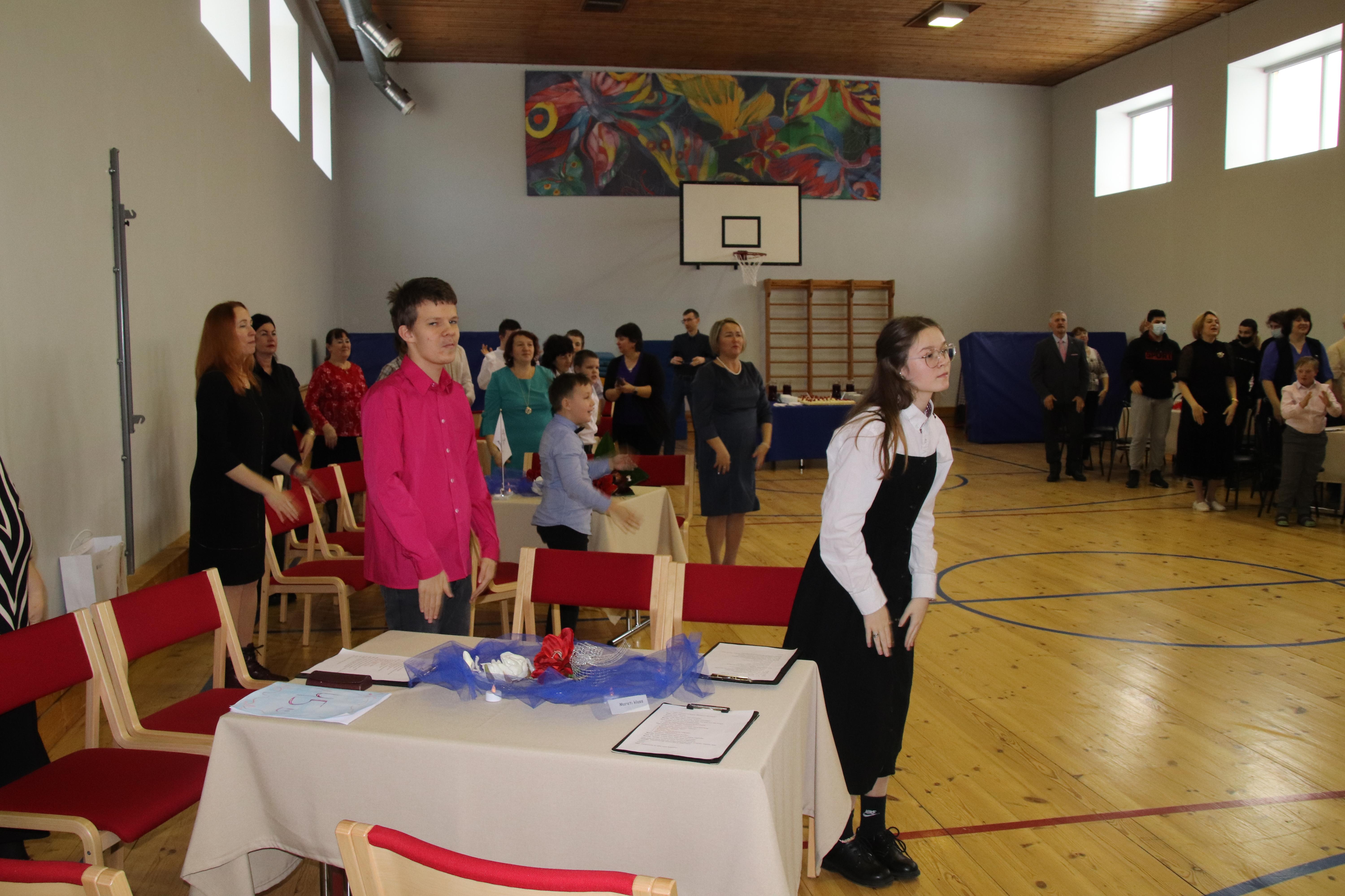 Kogunesime pidulikuks aktuseks saali, mis oli imekaunis. Selles oli meie õpetajate Vapu ja Jüri töö ja eeskätt imeteldavad ideed ja oskused. Sinisel taustal meisterlik ja kaunis lill, laudadel kompositsioonid. Juba saali seekordne paigutus oli tavalisest erinev: kahel pool lauad, mille taga istuti klasside kaupa. Keskel oli avarust esinejatele, kõik nägid kõiki.