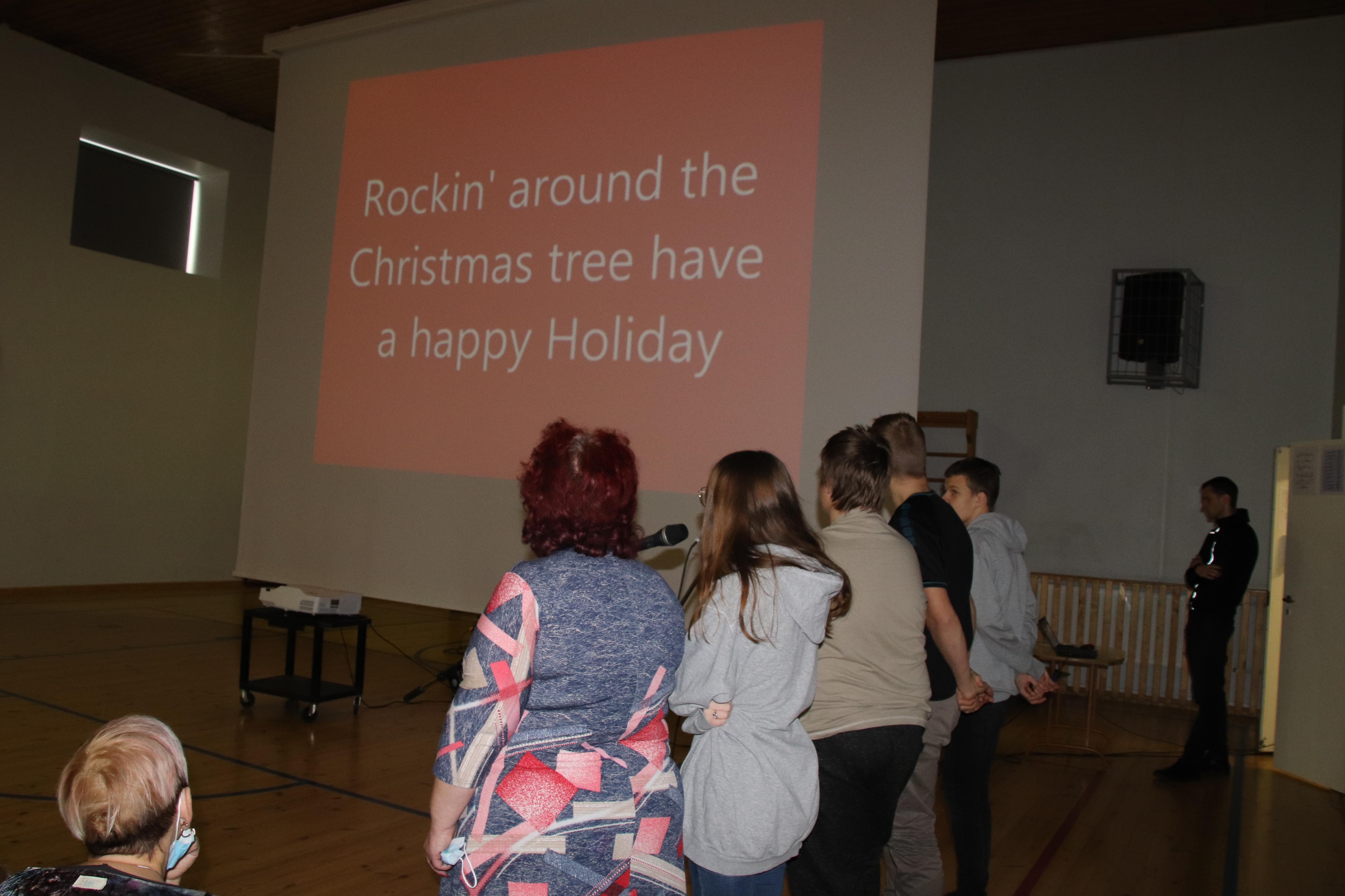 Seejärel aga algas jõululaulude esitamine ja kaasalaulmine, ekraanil laulusõnad. Õpetaja Oksana poisteklass oli ära õppinud „Oh kuusepuu“ saksa keeles ning olid eeslauljateks, õpetaja Mareti klass aga ingliskeelse „Aisakella“. Siis jätkus rõõmus jõululaulude karaoke, eestlauljateks muusikaõpetaja Merike ja õpetaja Õie. Vahepeal mindi ka koos tantsima ümber saali. Oli nii armas ja sõbralik õhkkond, lapsed ei tahtnud ära minna. Vaikselt hakkasid väiksemad klassid sööma minema, sest oli aeg. Ja kõik head asjad saavad kord otsa ning on, mida oodata edaspidi.