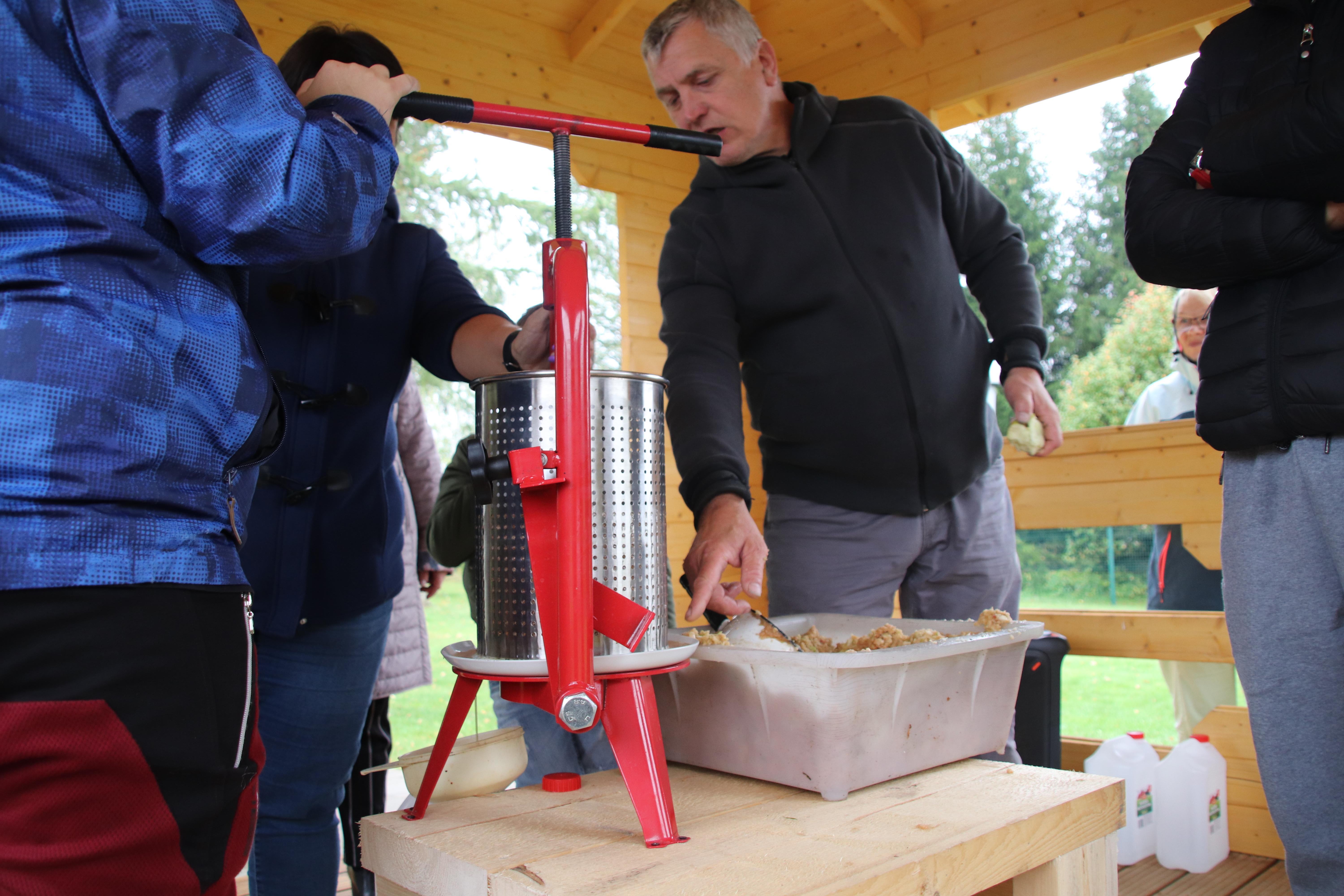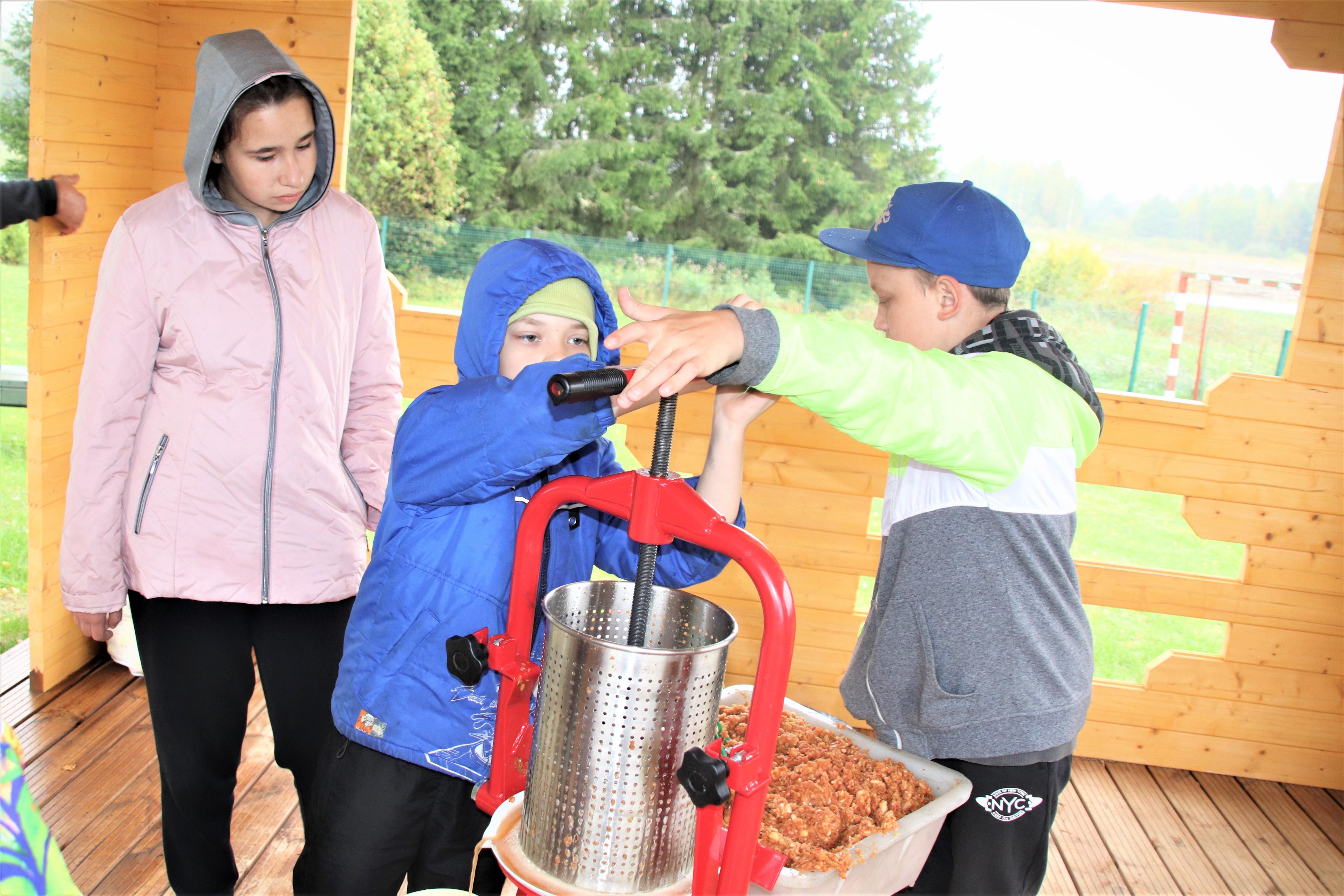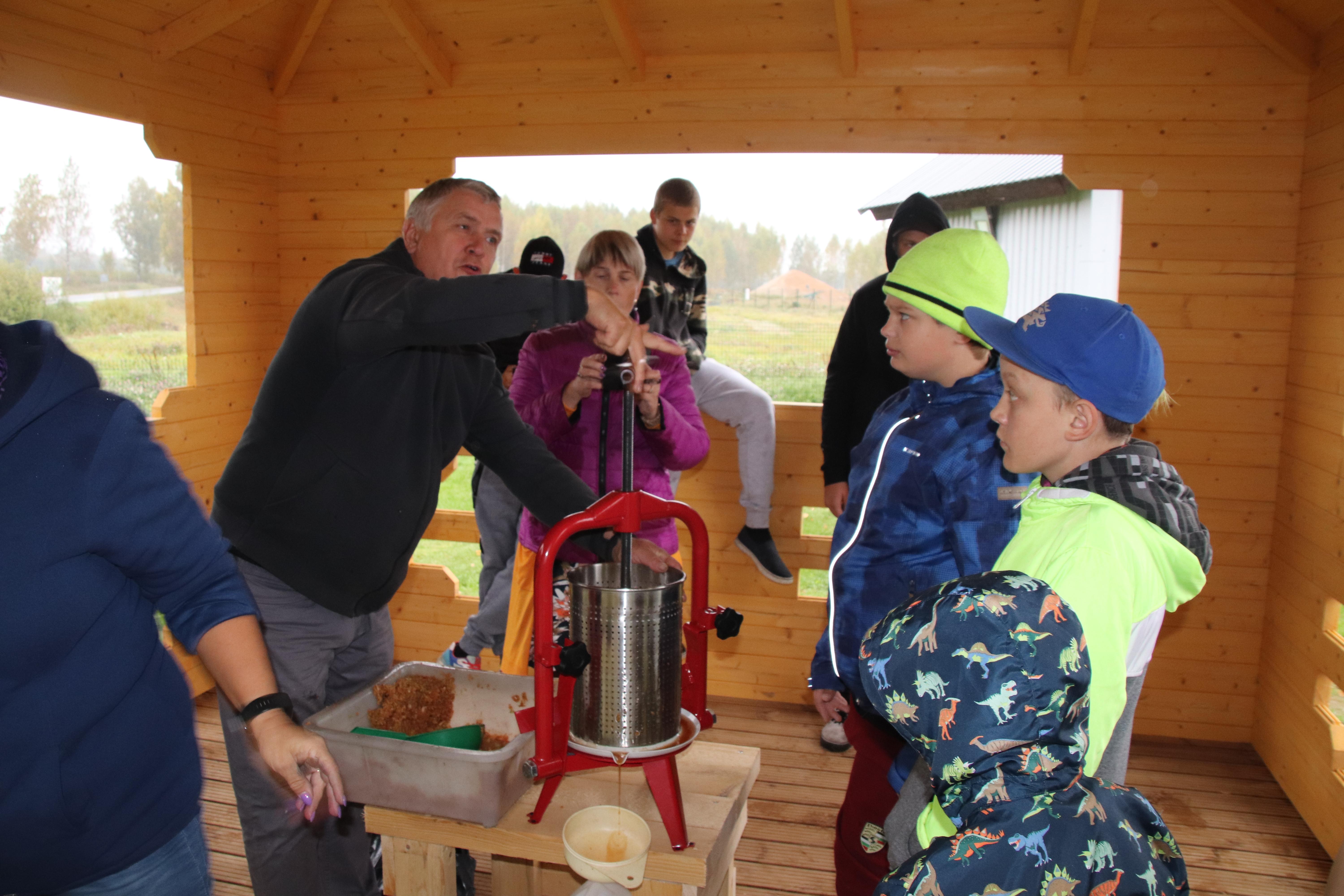 Purustatud mass viidi kõrvalolevasse õuesõppeklassi, kus pandi pressi silindrisse ja hakati siis pressi allapoole keerama. Algul jooksis mahl üsna kiiresti, hiljem tuli keeramisega rohkem vaeva näha. Selle päeva organisaator huvijuht Külli pani vahepeal ka muusika mängima. Mis saab veel toredam olla, kui koos tööd teha! Loomulikult oli Külli enne tegevuste algust ka selgitanud, mida talgud tähendavad. Õpetaja Jüri ja Janne olid igati abiks, et kõik kenasti sujuks.