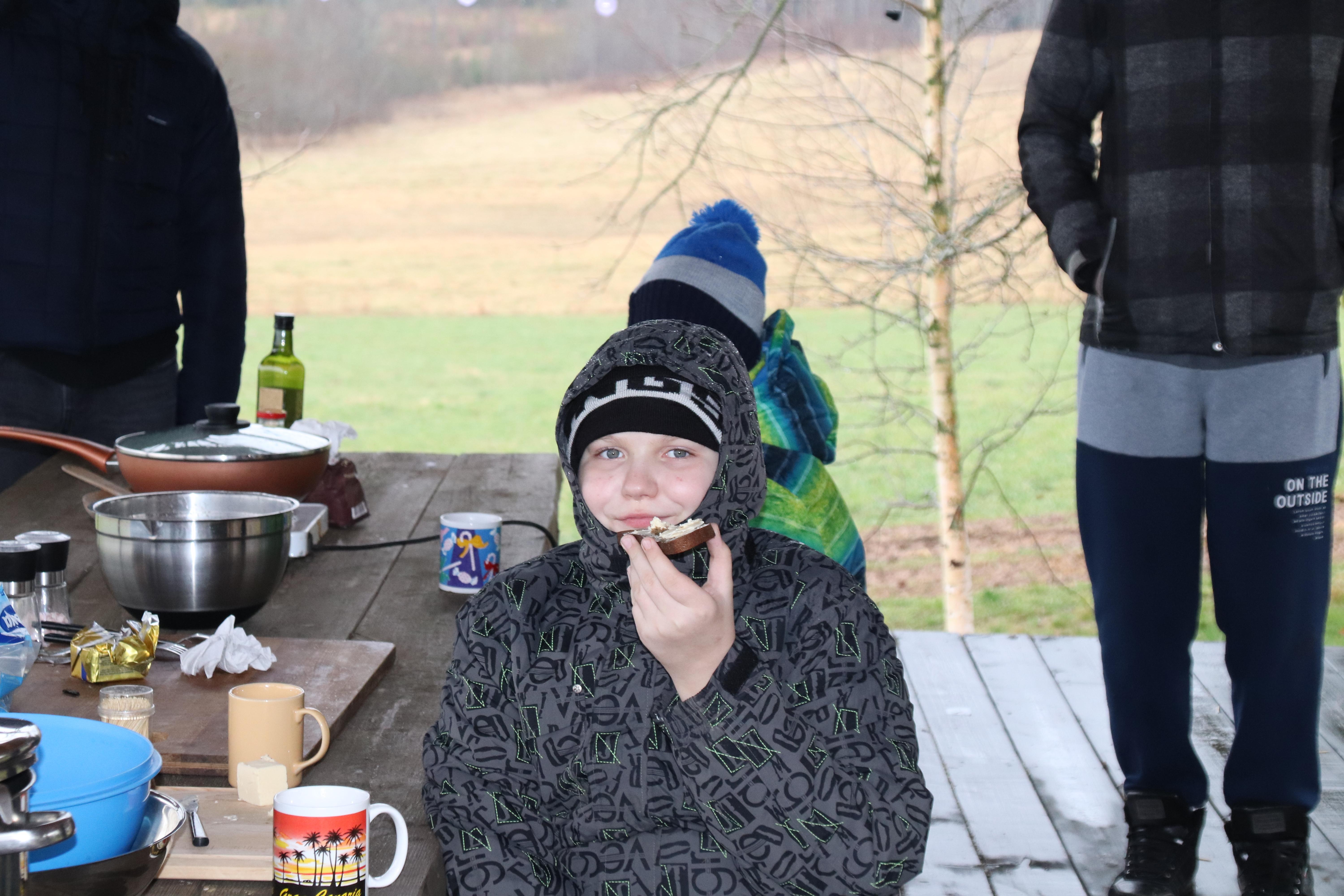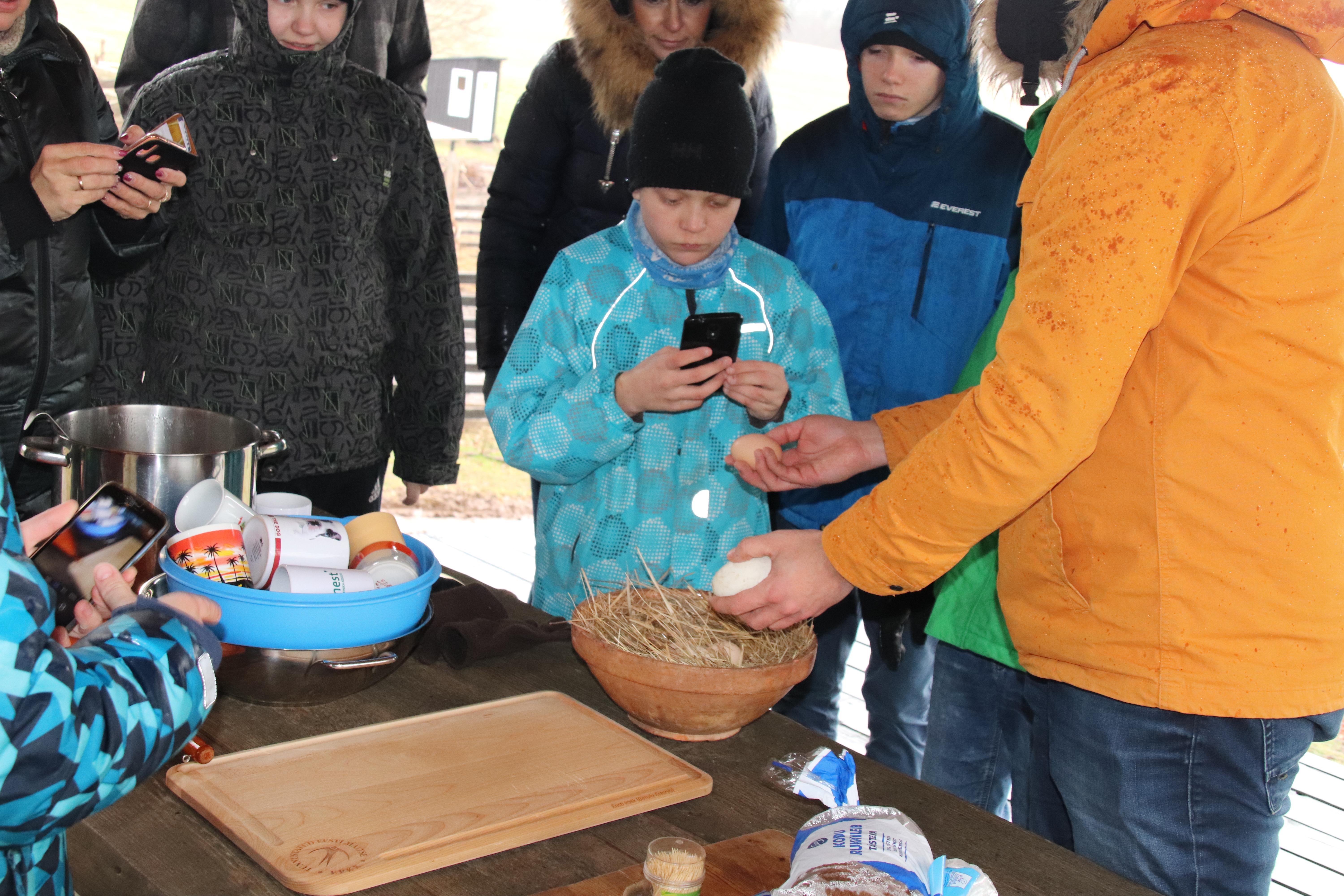 Seejärel viis peremees meid valmivasse varjualusesse, millel oli katus ja laud – toolid. Ümber tulevad veel klaasist seinad tulevikus. Tõusime sinna treppi mööda üles. Peremehel oli laual kaks elektripliiti, millel tegi meile omletti, nii kana- kui ka hanemunadest! Enne seda kaaluti mõlemaid mune – hanemuna on üle kahe korra raskem! Isegi rüblikud poisid ootasid kenasti laua ääres, olid viisakad, kuulasid selgitusi. Vahepeal leidsime elumaja aknalt ühe pisipõnni, kes saavat just 2 aastaseks. Peres on kokku kolm last, üks alla aastane.