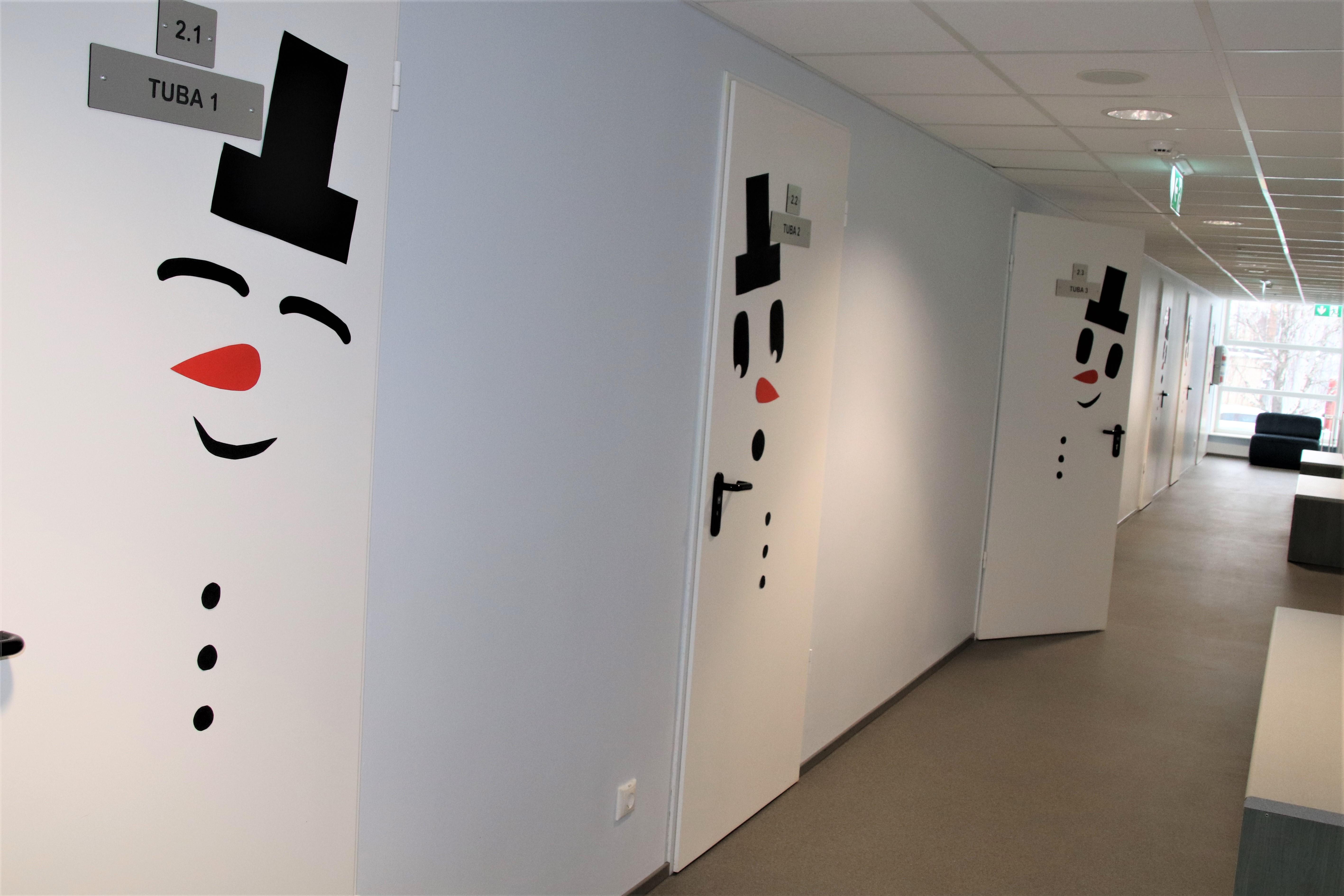 Lumest võlutud, valmisid õpilaskodu ustele rõõmsad paberist lumemehed, kõigil eri ilme ja nägu.